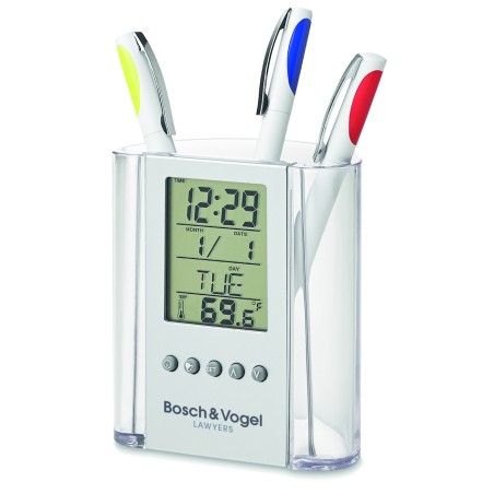 Porte stylo avec pendulette, calendrier et thermomètre. 1 pile bouton incluse.