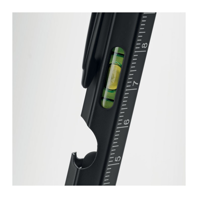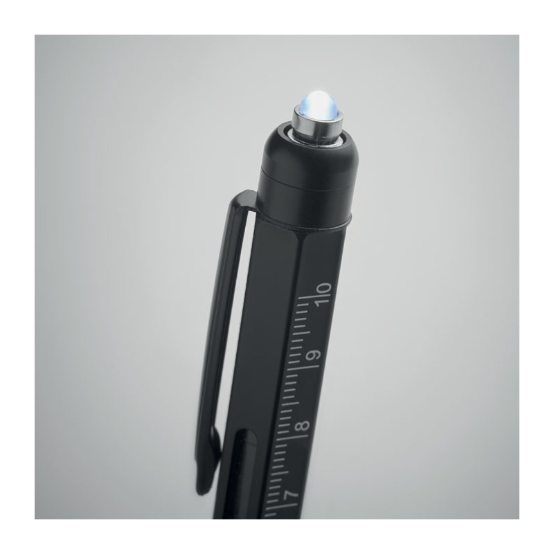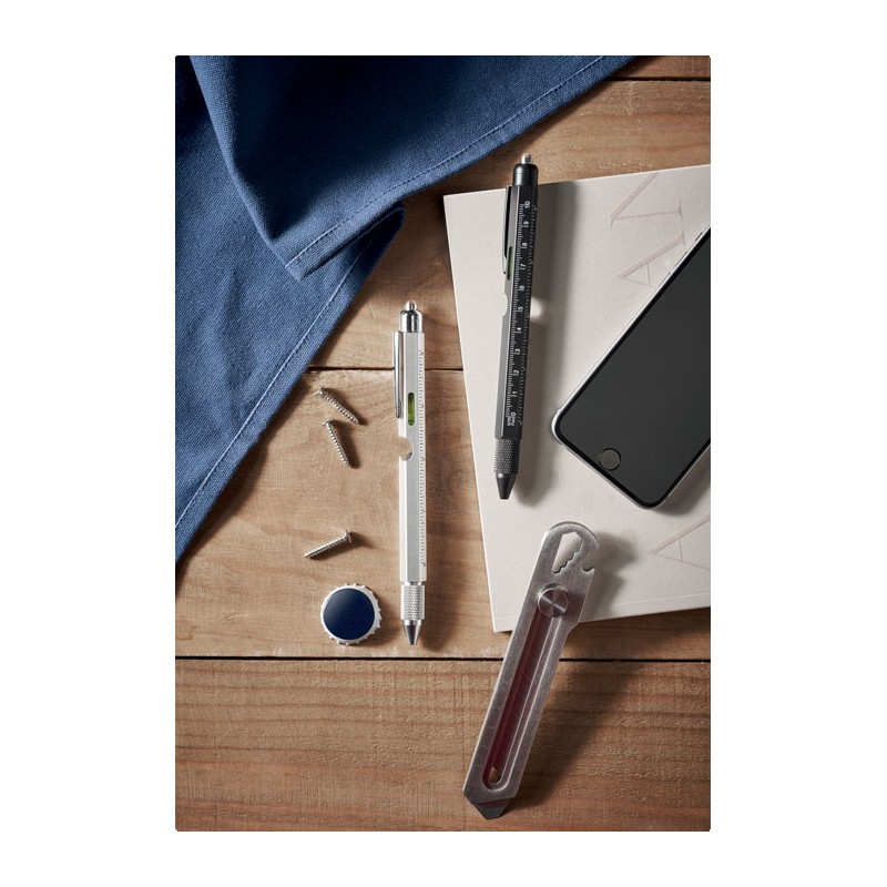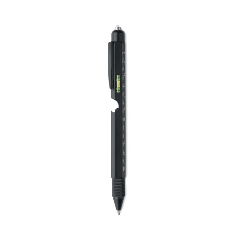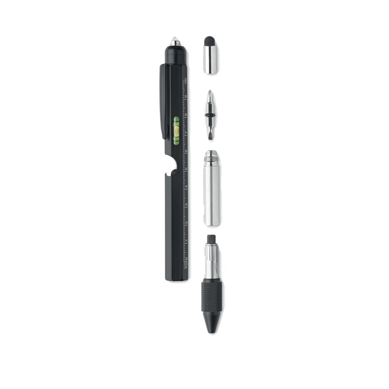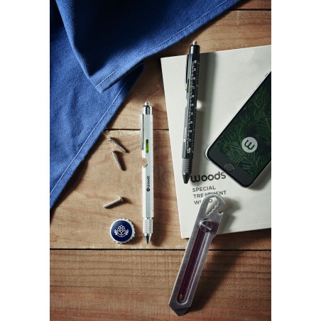 Stylo multifonctions en acier inoxydable incluant : niveau à bulle, règle, stylet, tournevis cruciforme et à tête plate, lampe LED. 3 piles AG incluses. Encre bleue.