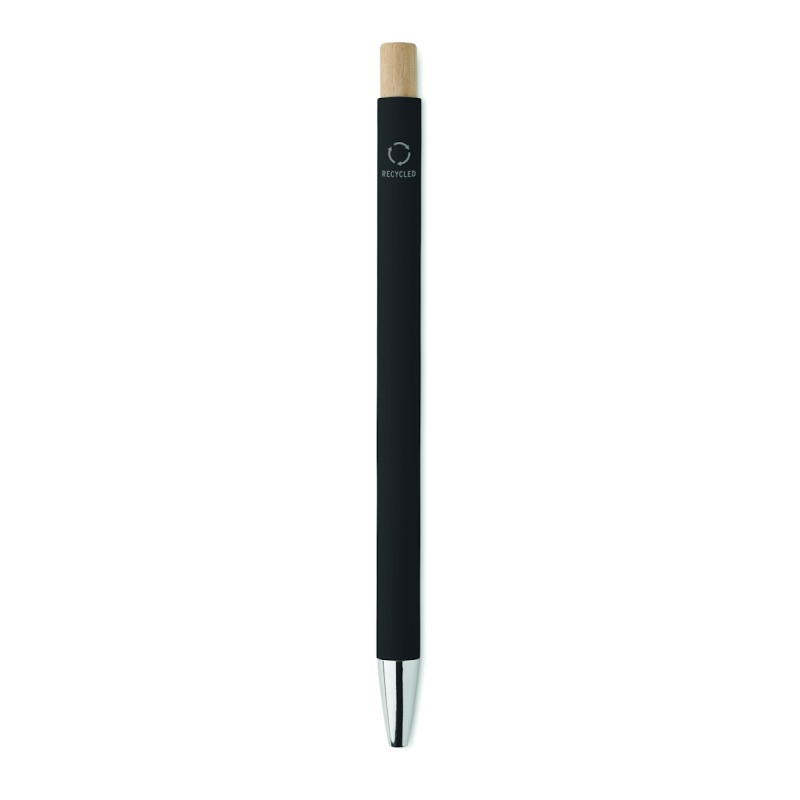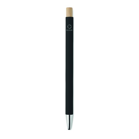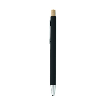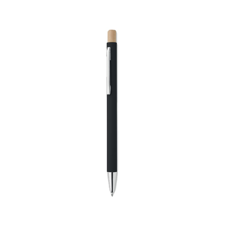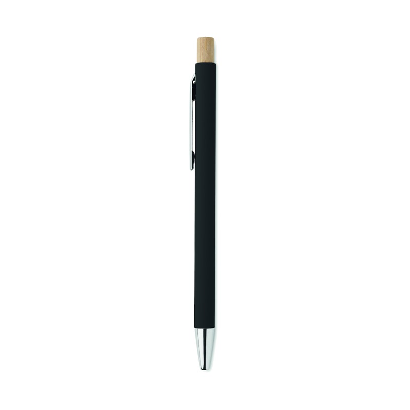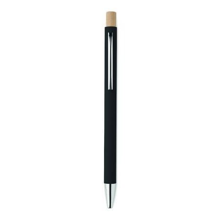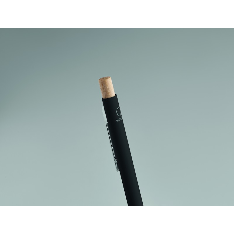 Stylo à bille en aluminium recyclé avec bouton poussoir en bambou. Pointe et clip argentés. Encre bleue.