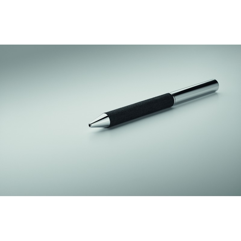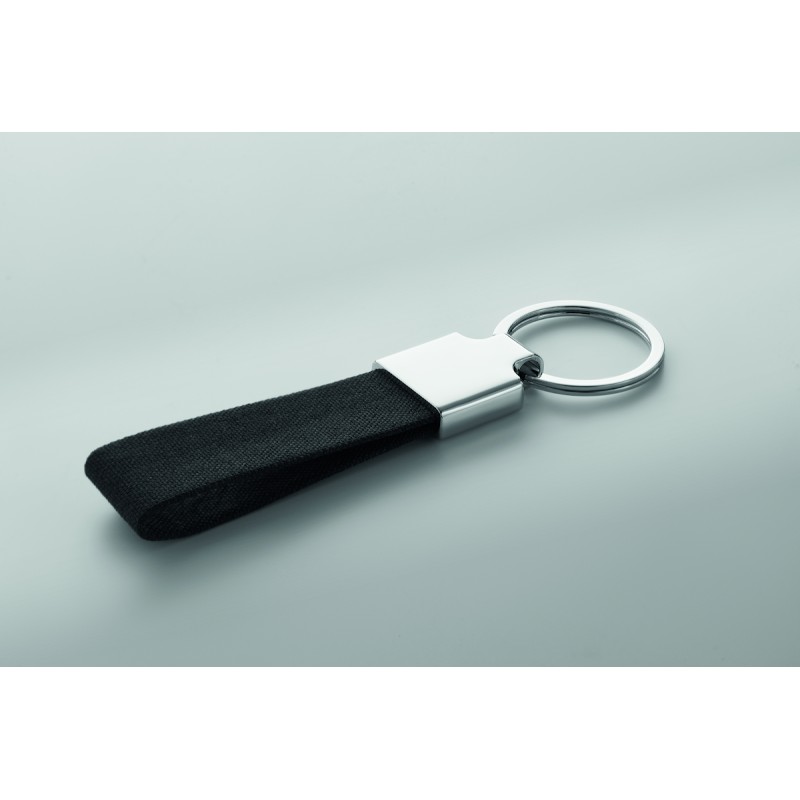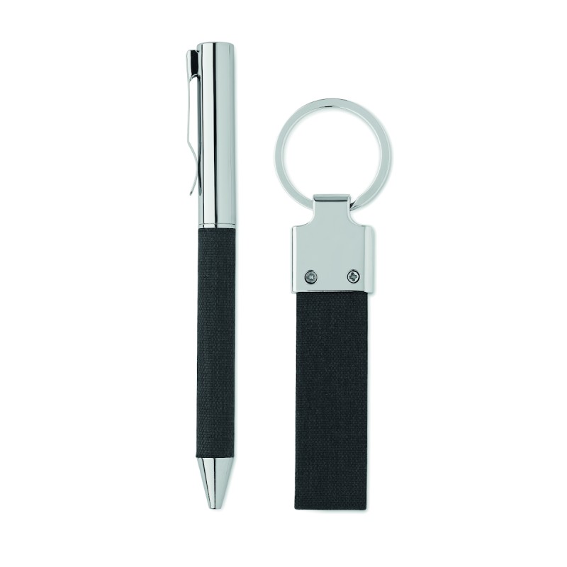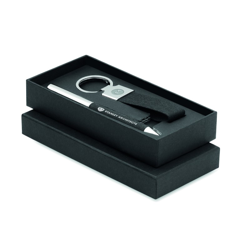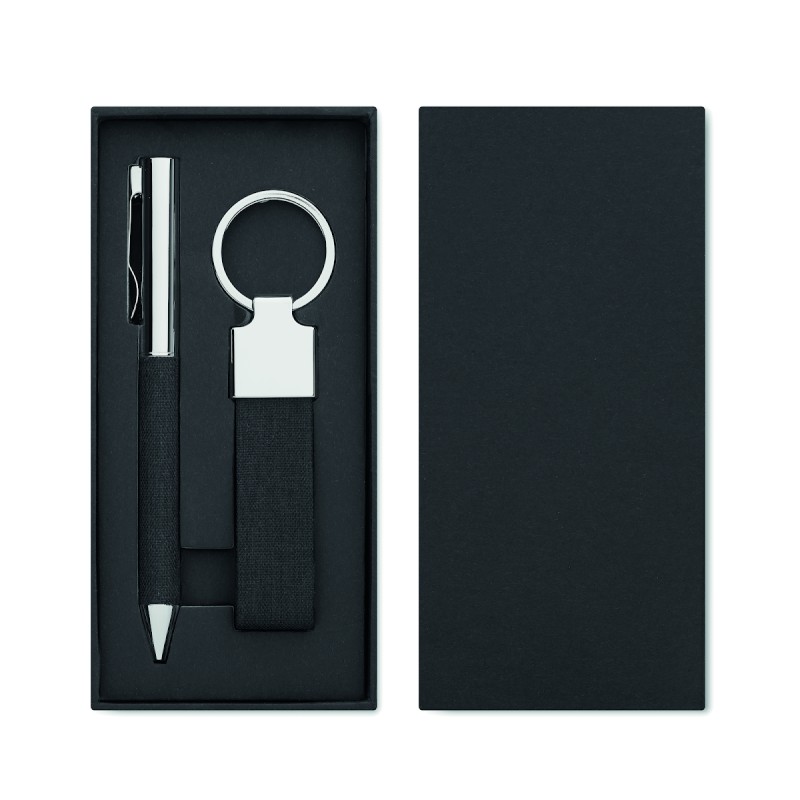 Set de 2 pièces dans un coffret cadeau. Comprend un stylo bille twist en métal avec détails en polyester RPET et un porte-clés en polyester RPET. Encre bleue.