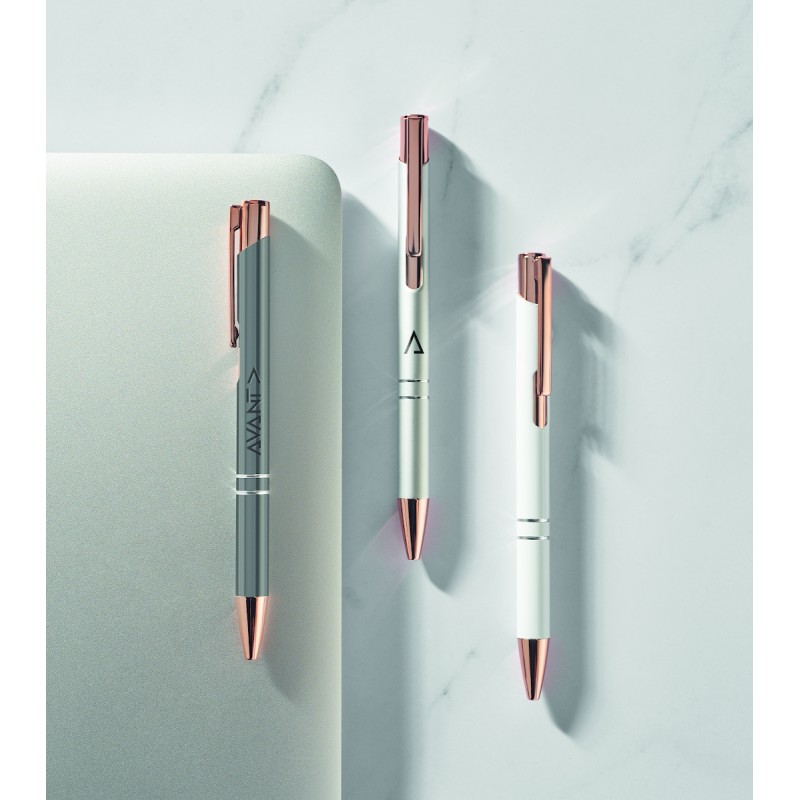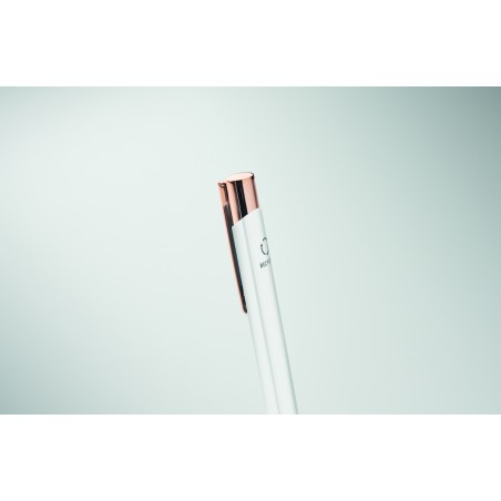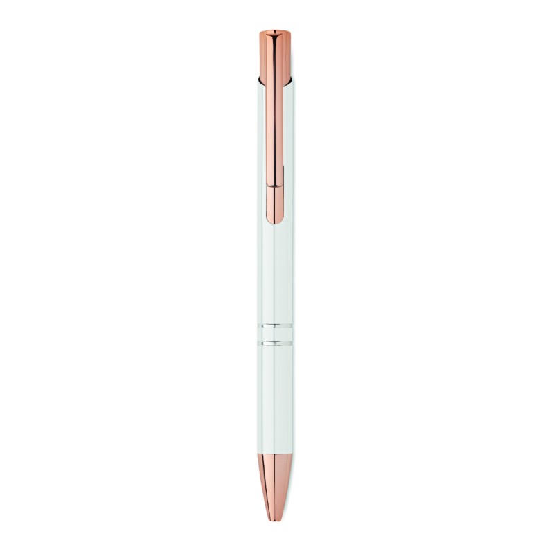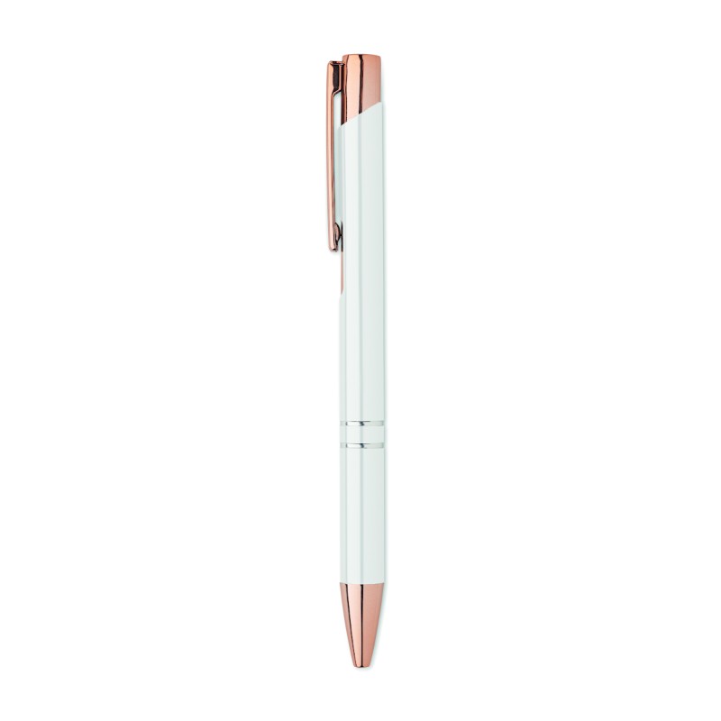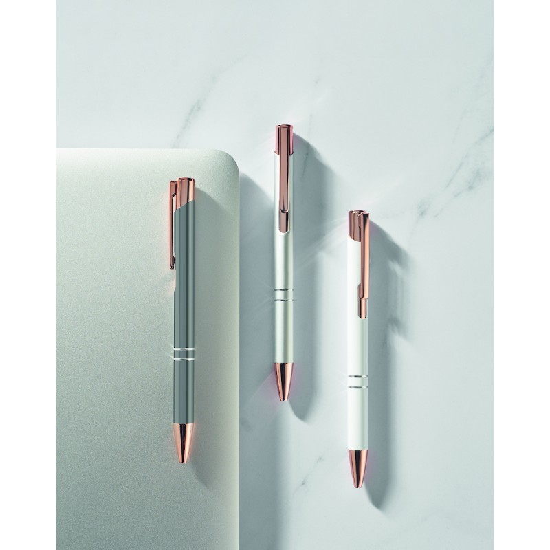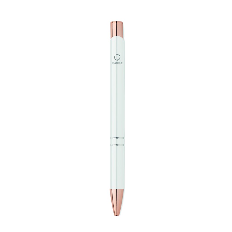 Stylo à bouton poussoir en aluminium recyclé avec détails en façon or rose. Encre bleue.