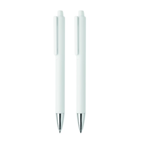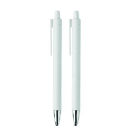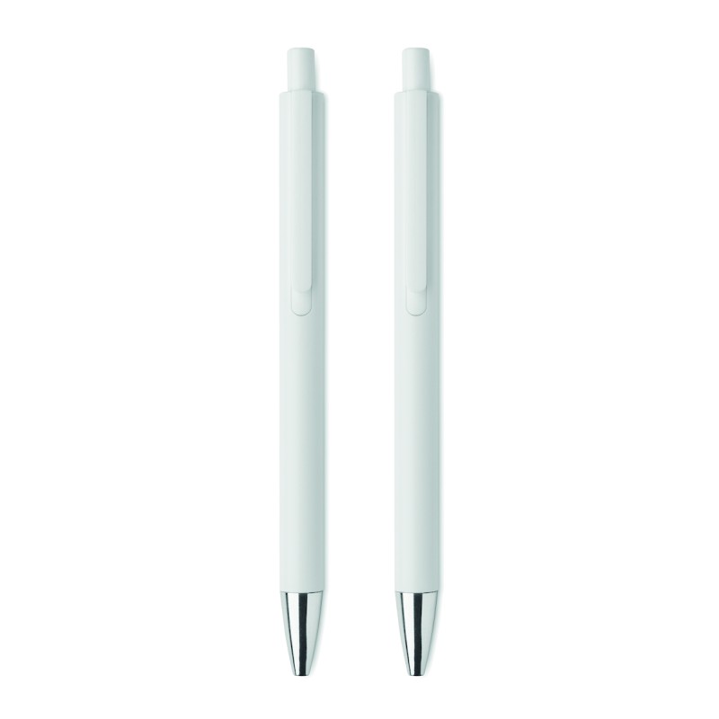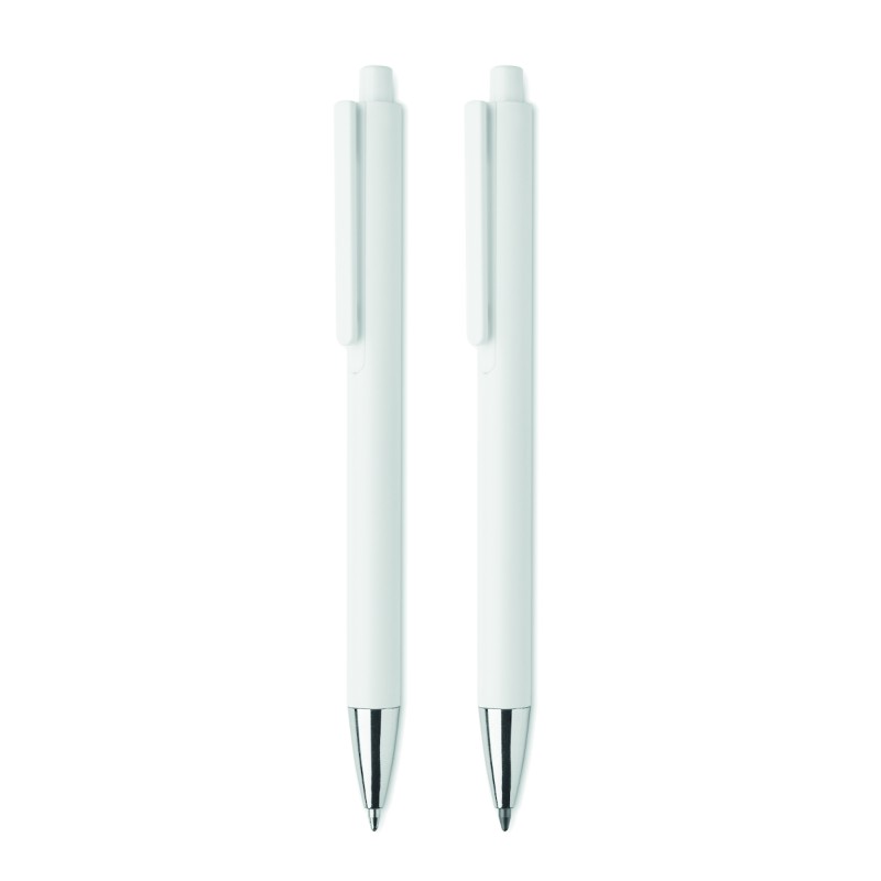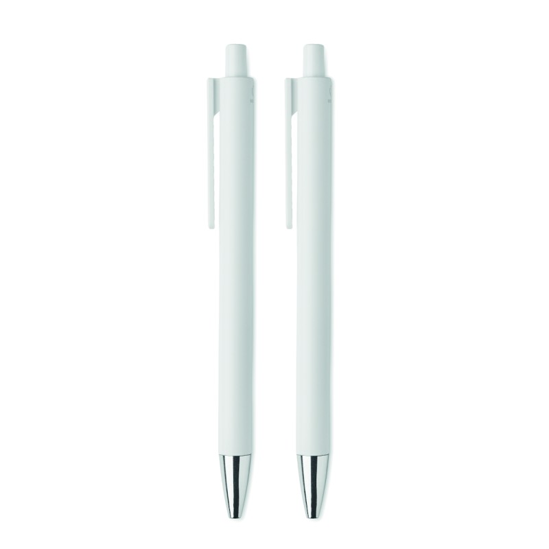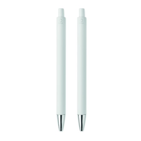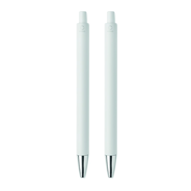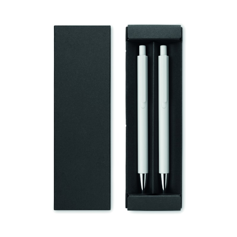 Parure de stylos en aluminium recyclé comprenant 1 stylo bille à poussoir (encre bleue) et 1 stylo graphite sans encre. Présentée dans une boîte en papier recyclé.