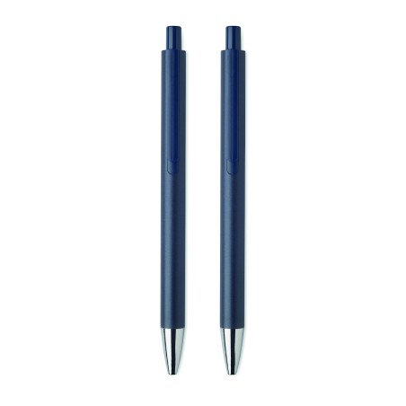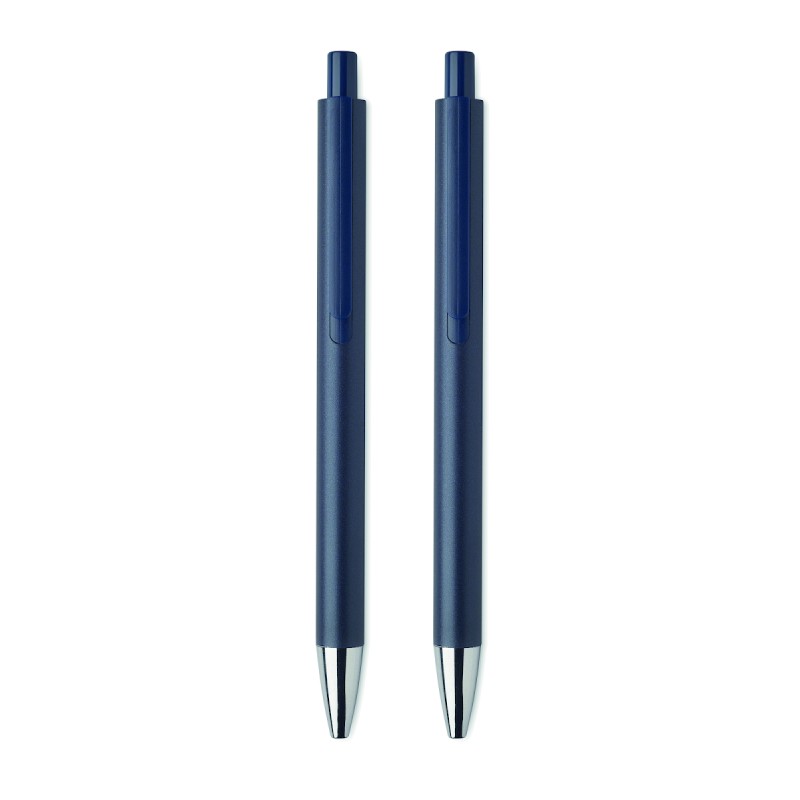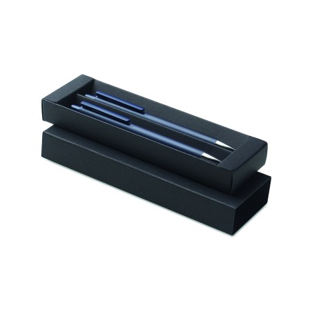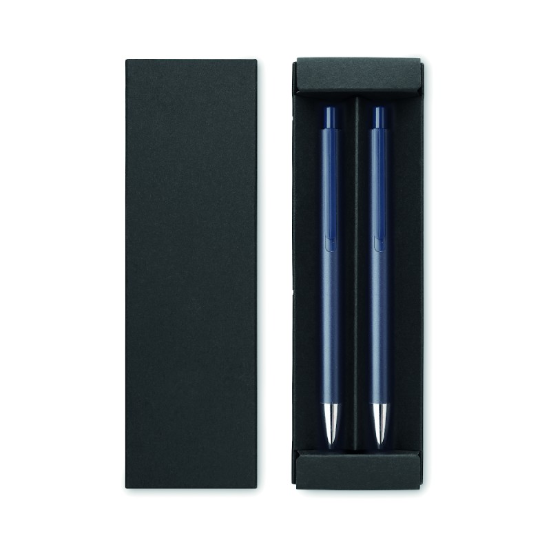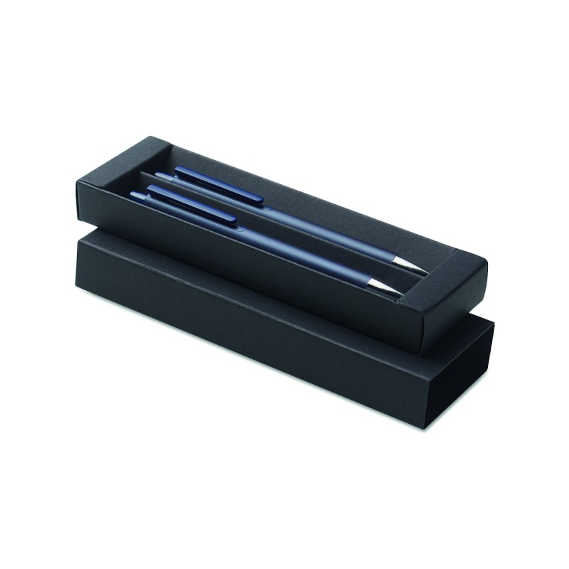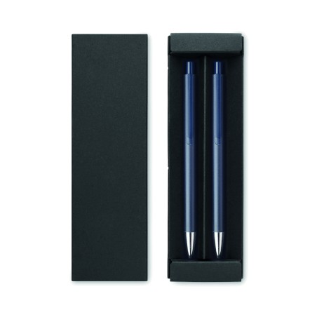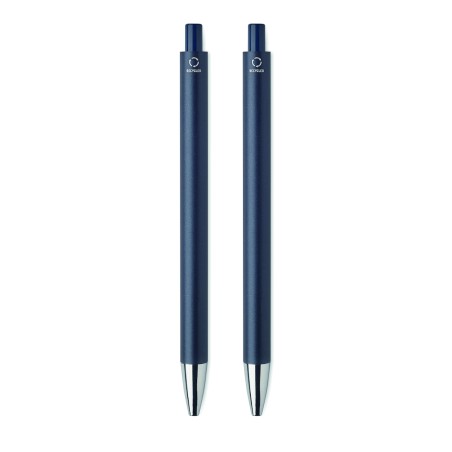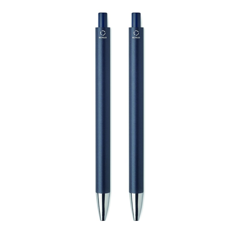 Parure de stylos en aluminium recyclé comprenant 1 stylo bille à poussoir (encre bleue) et 1 stylo graphite sans encre. Présentée dans une boîte en papier recyclé.