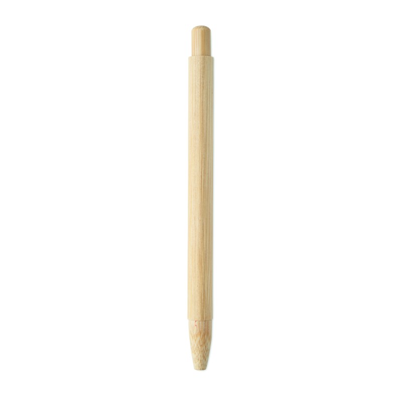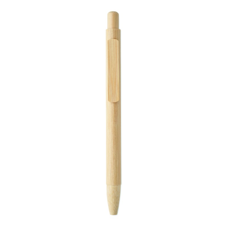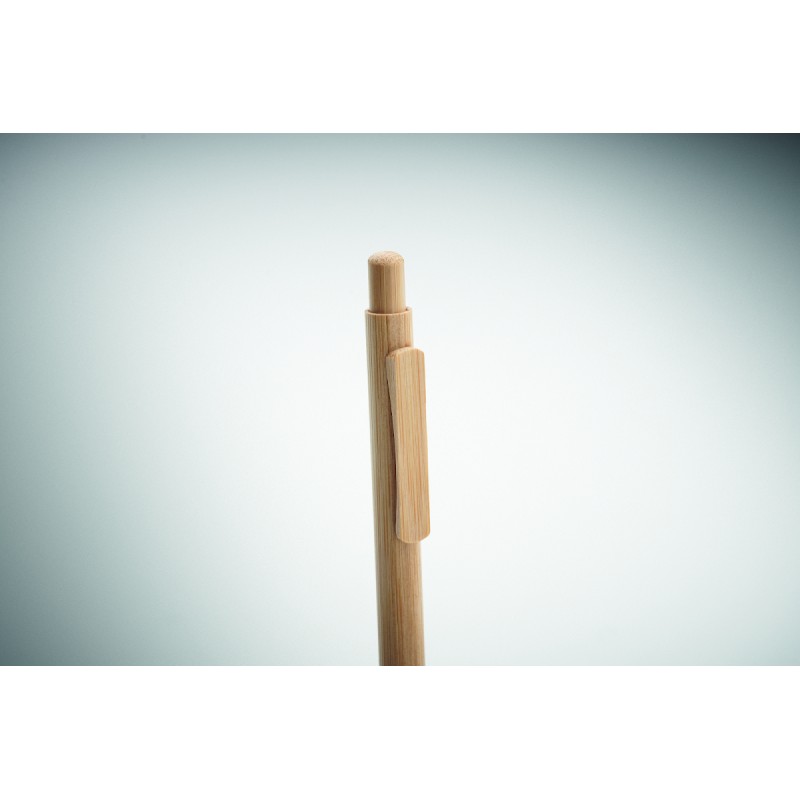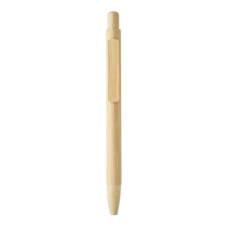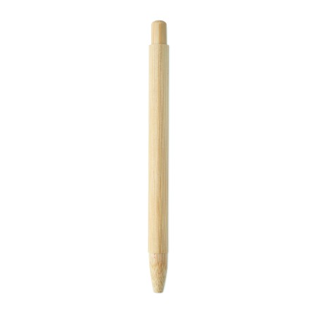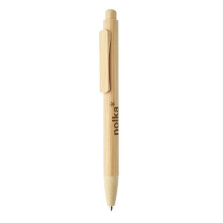Stylo à bouton poussoir avec corps, pointe et clip en bambou. Encre bleue.