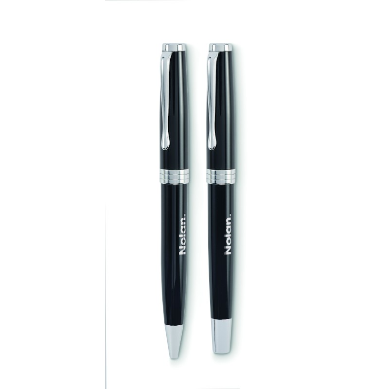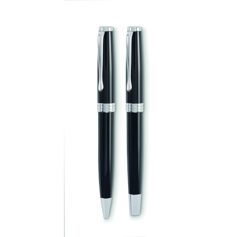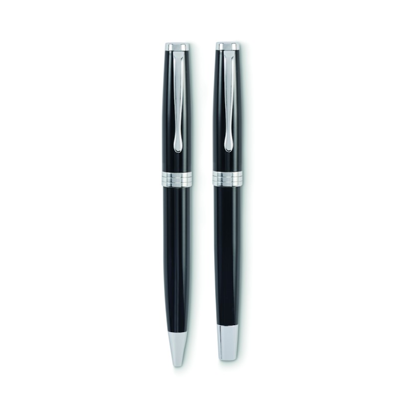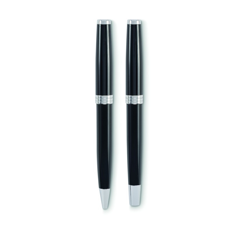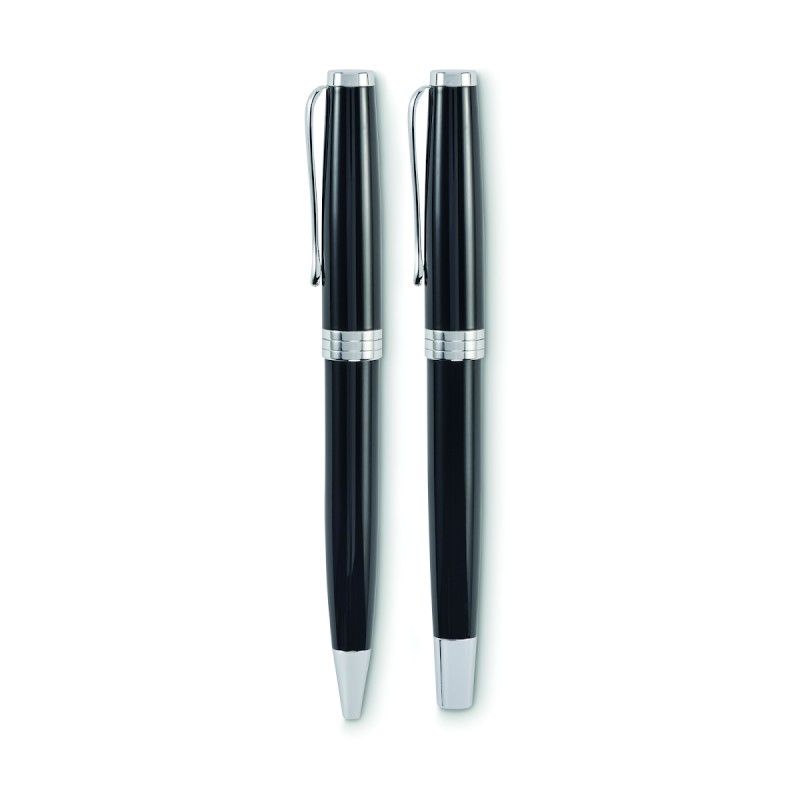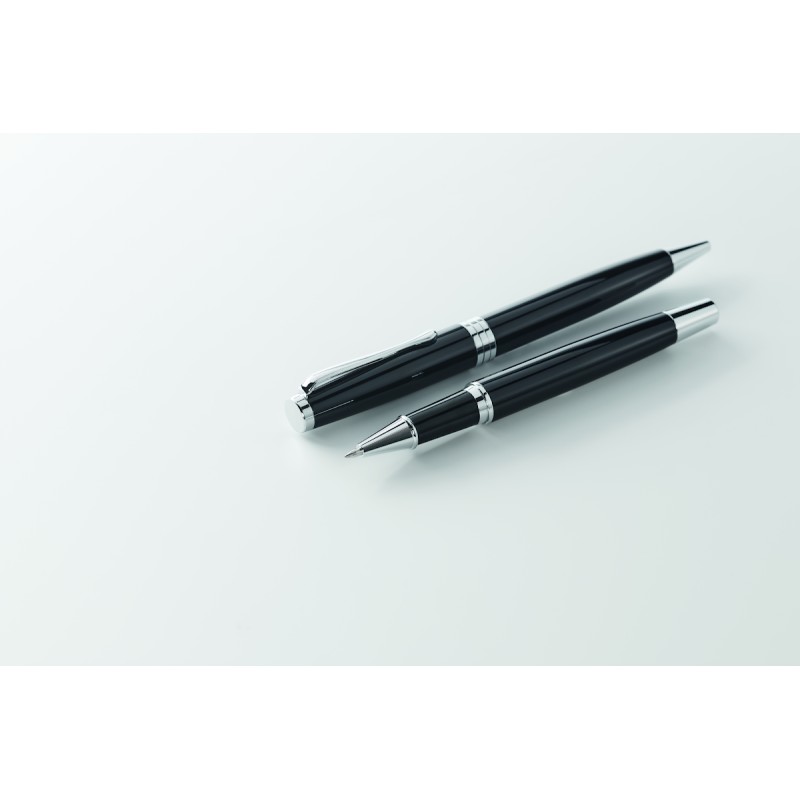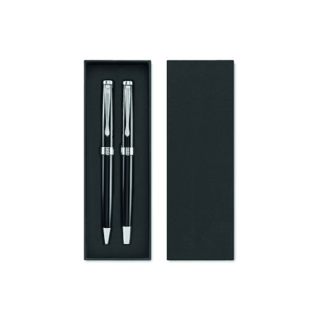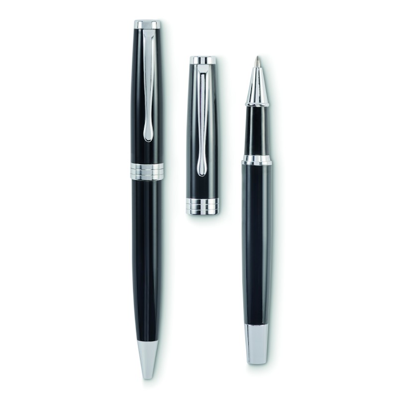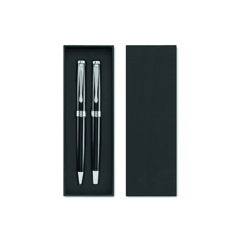 Set de stylo bille twist et roller dans un corps en acier inoxydable recyclé. Encre bleue et noire respectivement. Présenté dans une boîte noire.