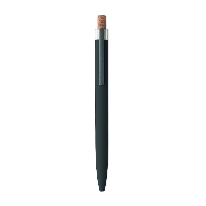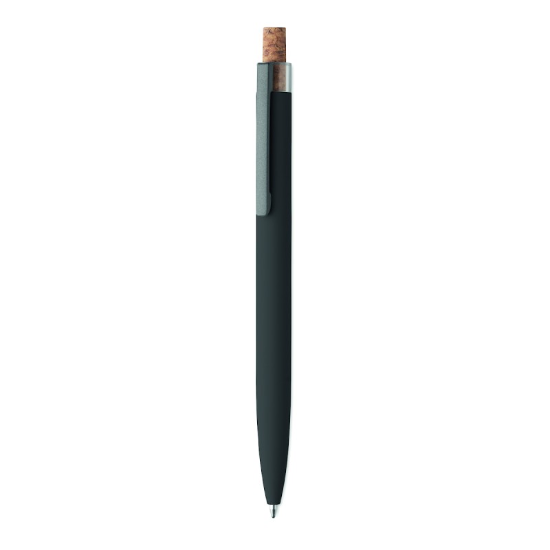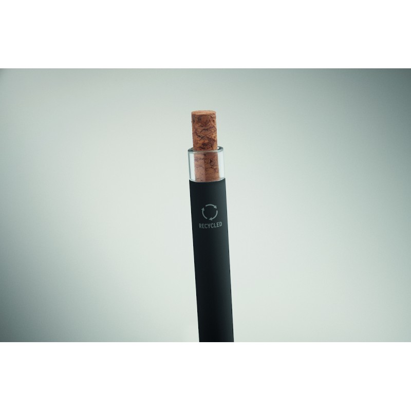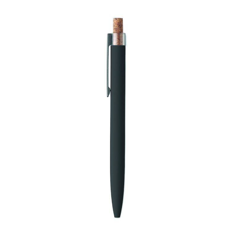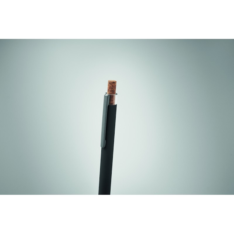Stylo bille en aluminium recyclé avec bouton poussoir en liège et clip en métal. Encre bleue.