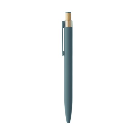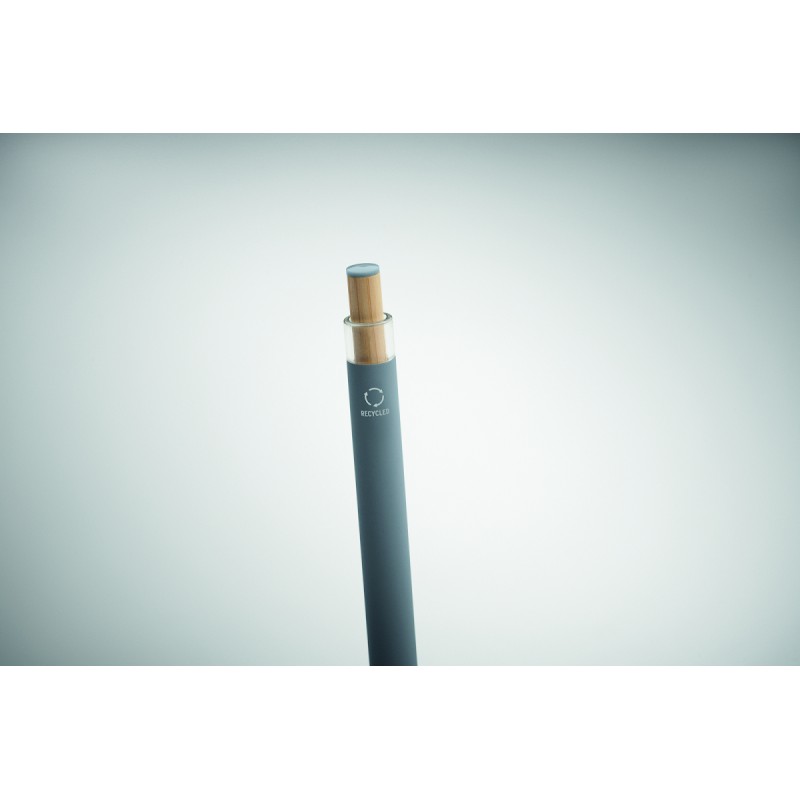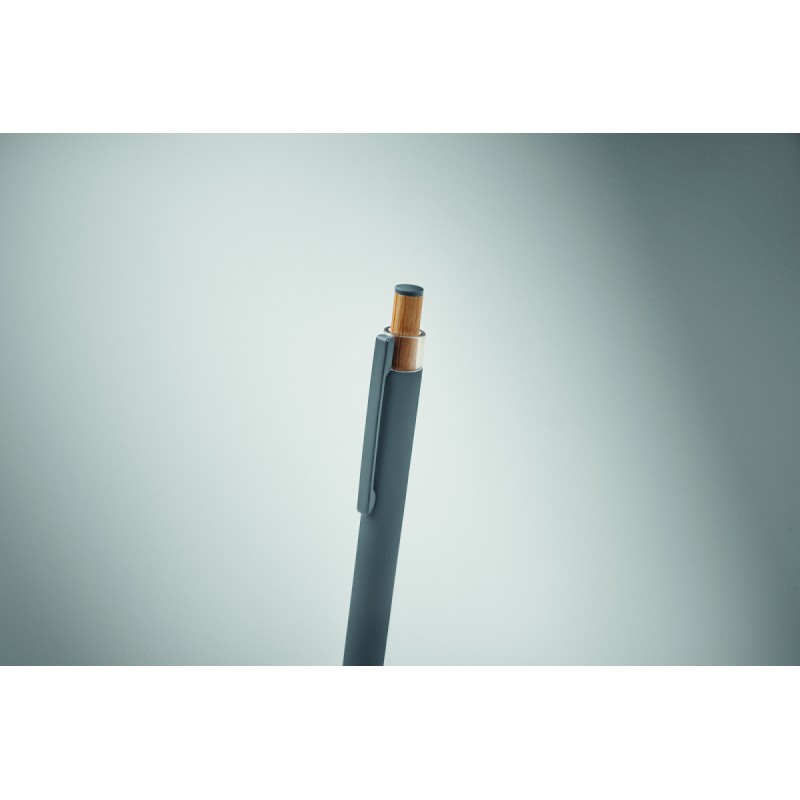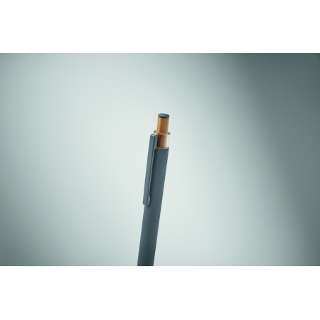 Stylo à bille en aluminium recyclé avec bouton poussoir en bambou de couleur assortie et clip en métal assorti. Encre bleue.