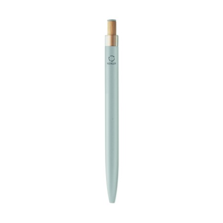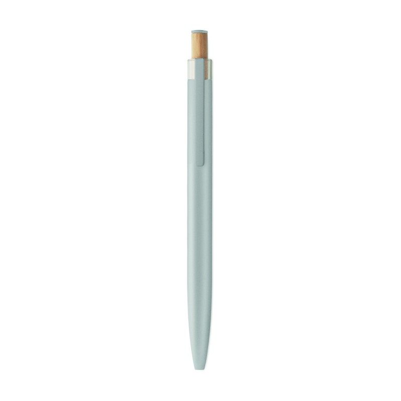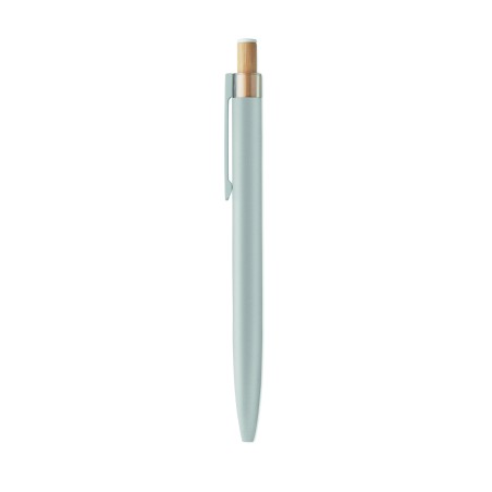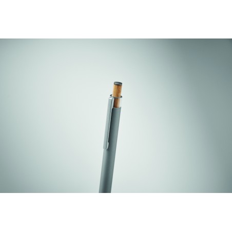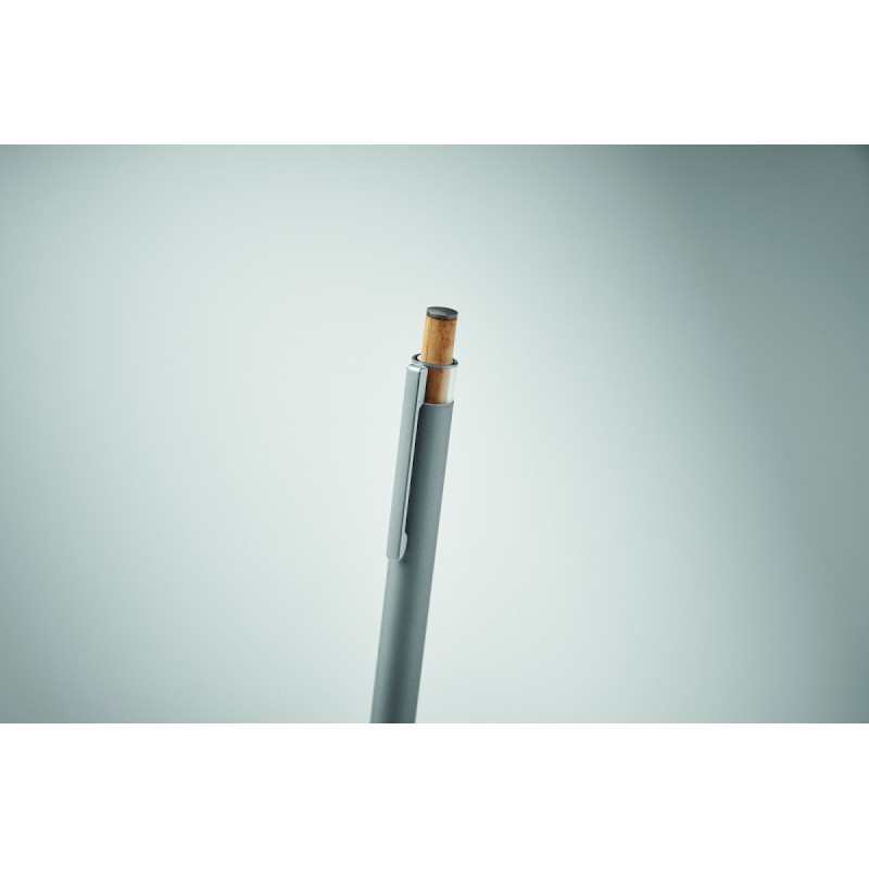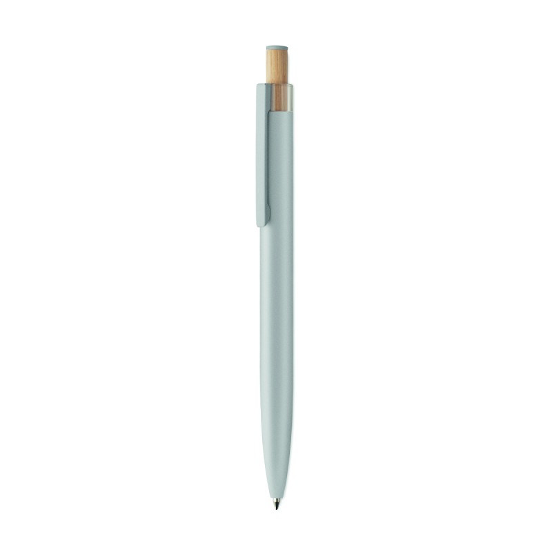 Stylo à bille en aluminium recyclé avec bouton poussoir en bambou de couleur assortie et clip en métal assorti. Encre bleue.