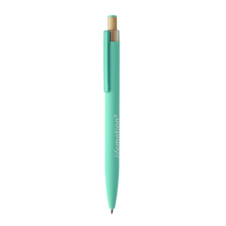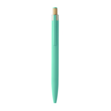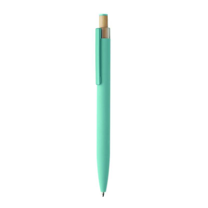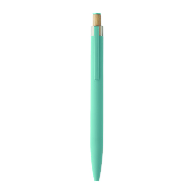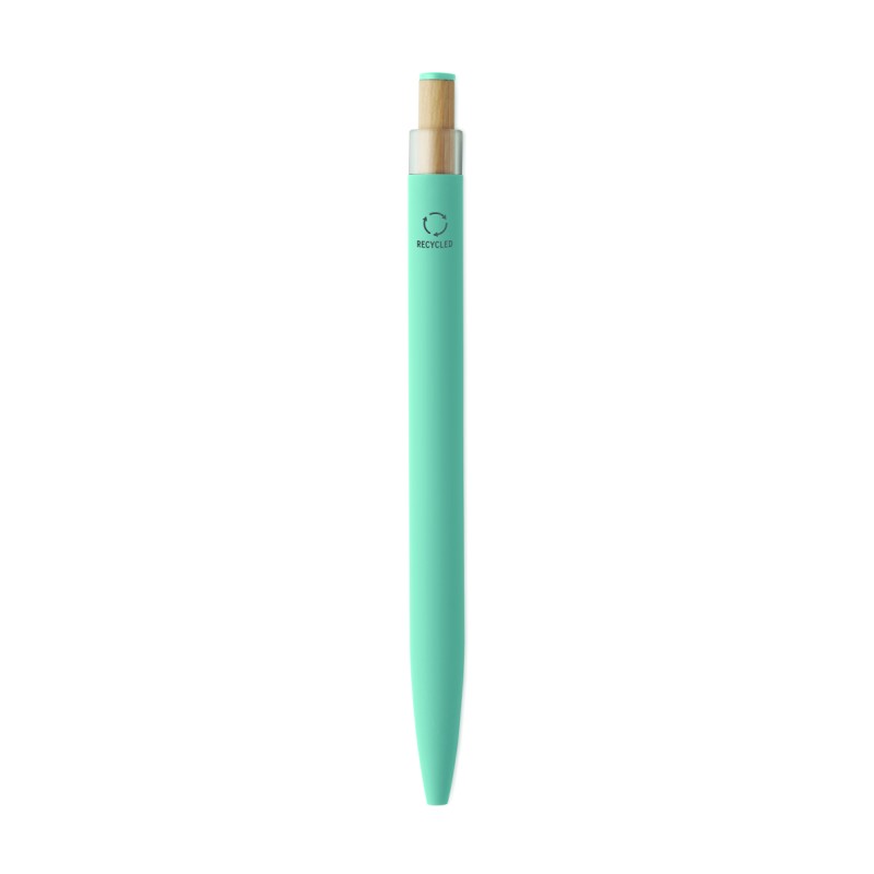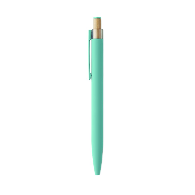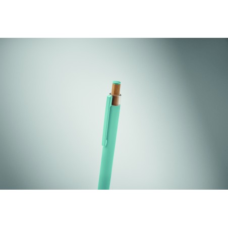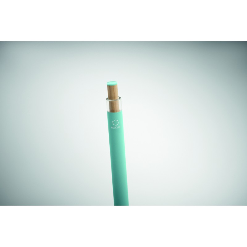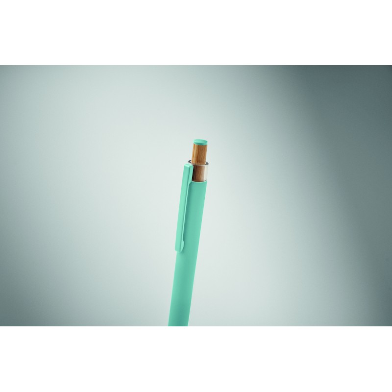 Stylo à bille en aluminium recyclé avec bouton poussoir en bambou de couleur assortie et clip en métal assorti. Encre bleue.