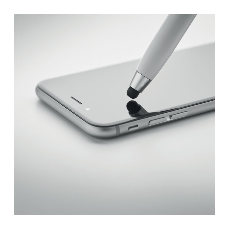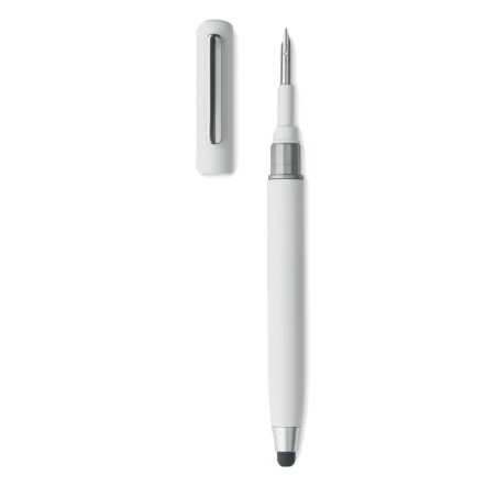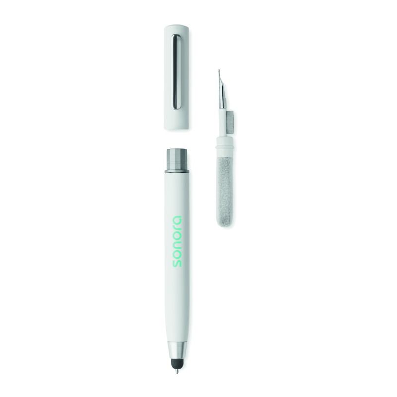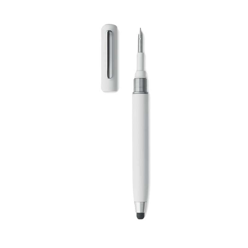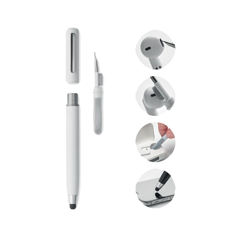 Stylo à bille twist avec stylet en ABS. Comprend également un Kit de nettoyage pour oreillettes sans fil : pince métallique, éponge et brosse. Encre bleue.