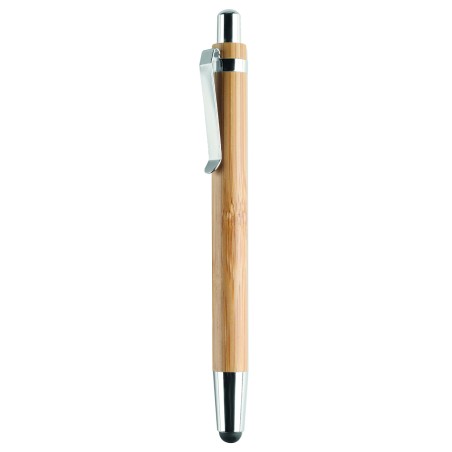 Stylo à bille en ABS et bambou avec clip métal. Extrémité souple. Encre bleue. Le bambou est un produit naturel, et présente de légères variations de couleur, de décoration et de tailles.