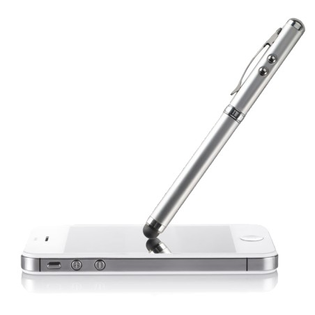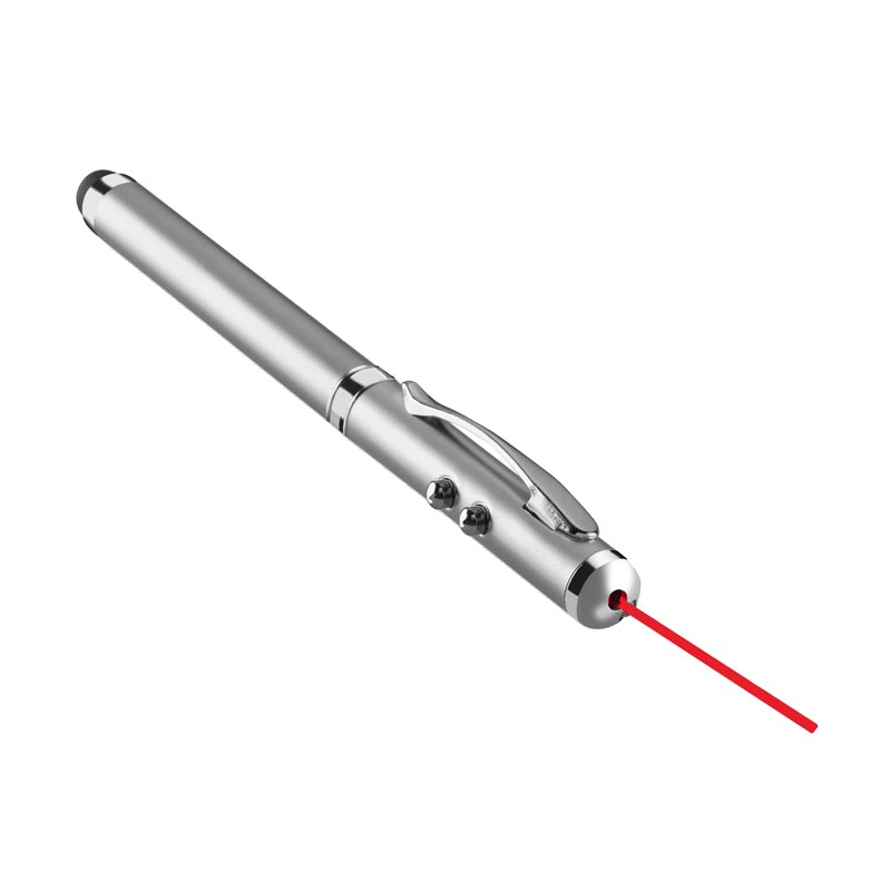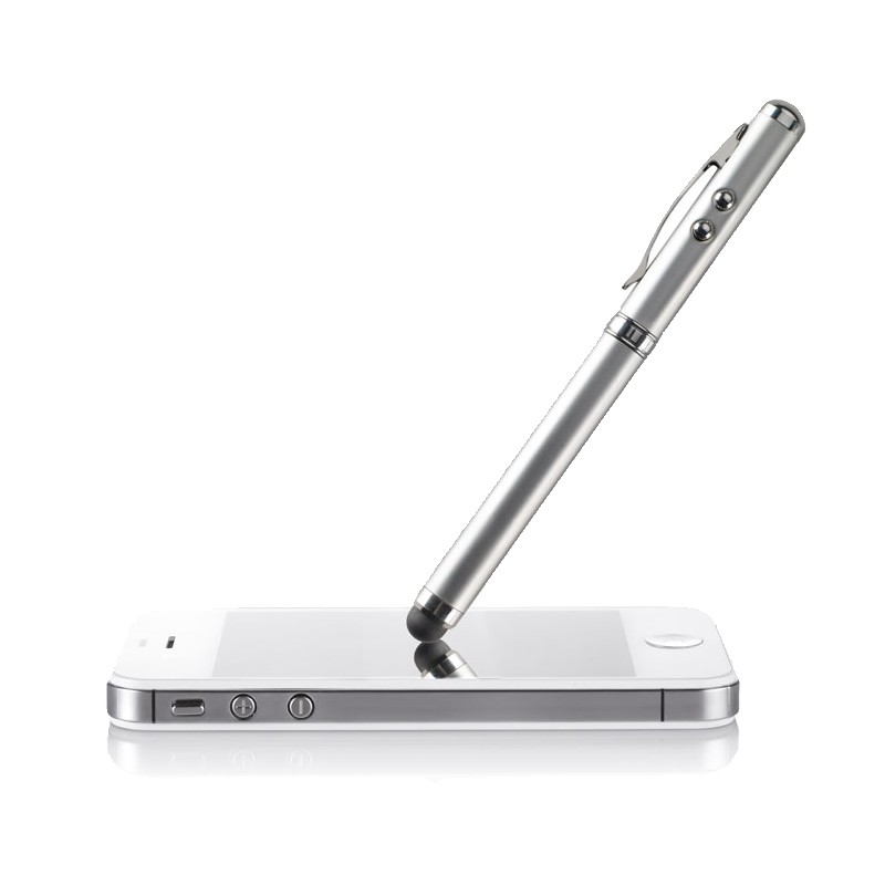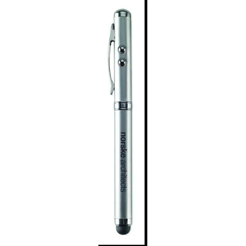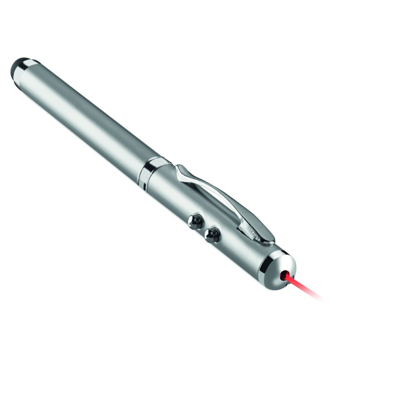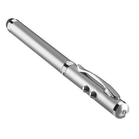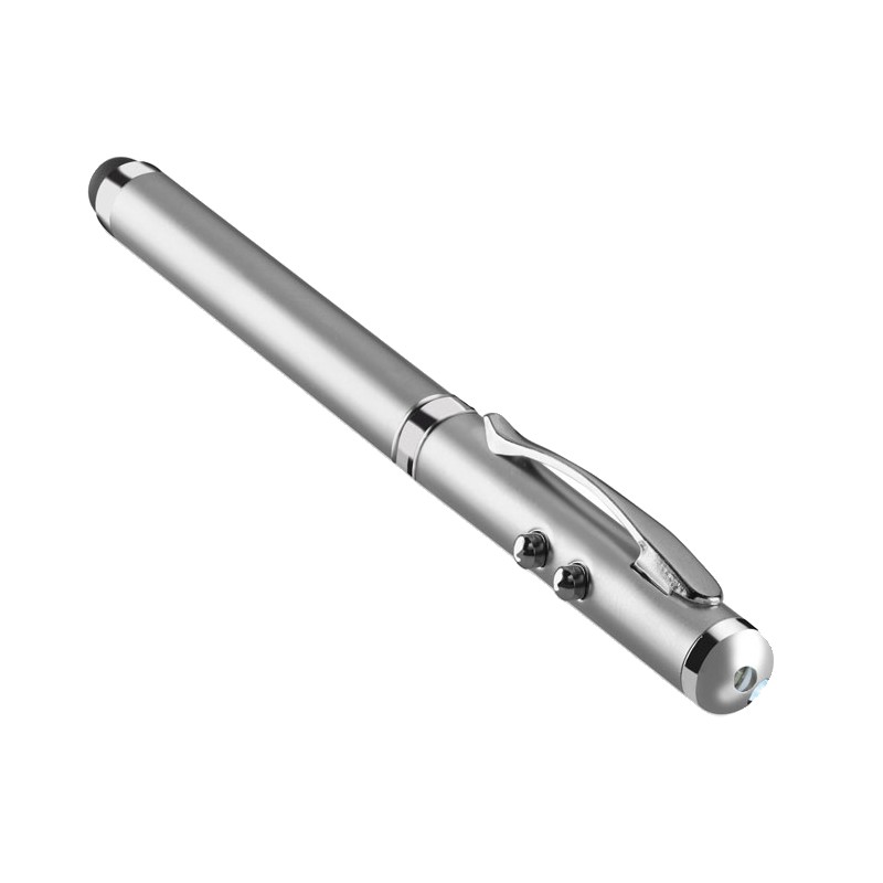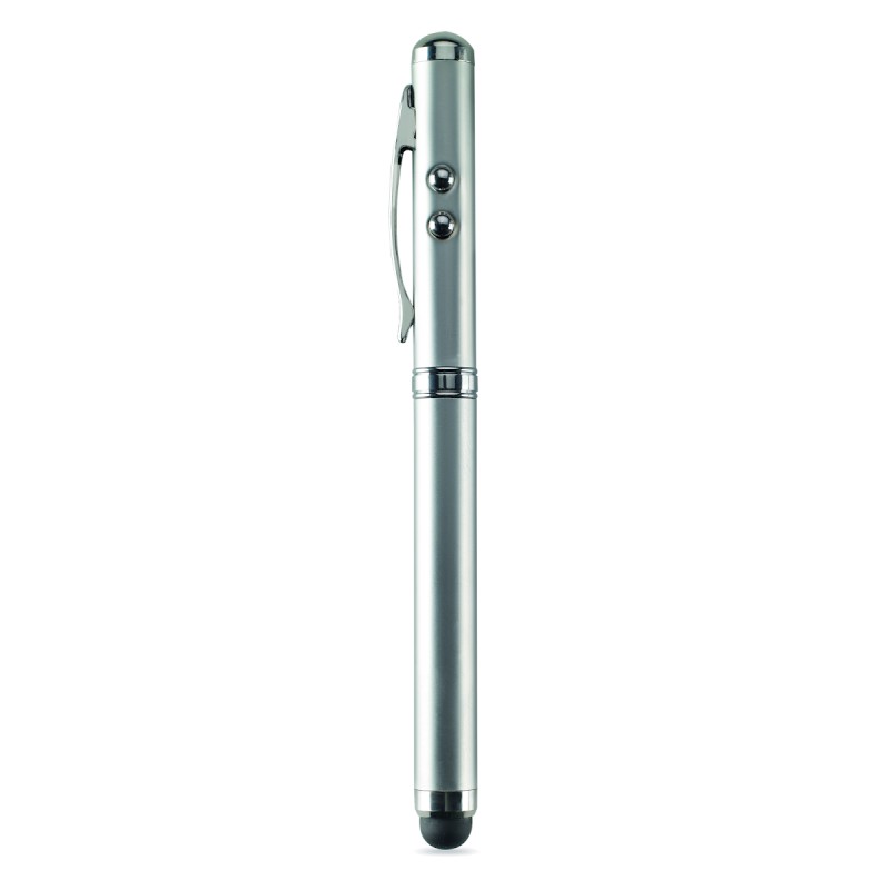 Stylo à bille multifonction en métal. Encre noire, avec LED blanche, pointeur laser rouge et stylet pour écrans tactiles. 3 piles boutons incluses. Livré dans une boîte métallique.