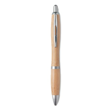 Stylo bille à bouton poussoir avec corps en bambou et attributs en ABS. Encre bleue. Le bambou est un produit naturel, et présente de légères variations de couleur, de décoration et de tailles.