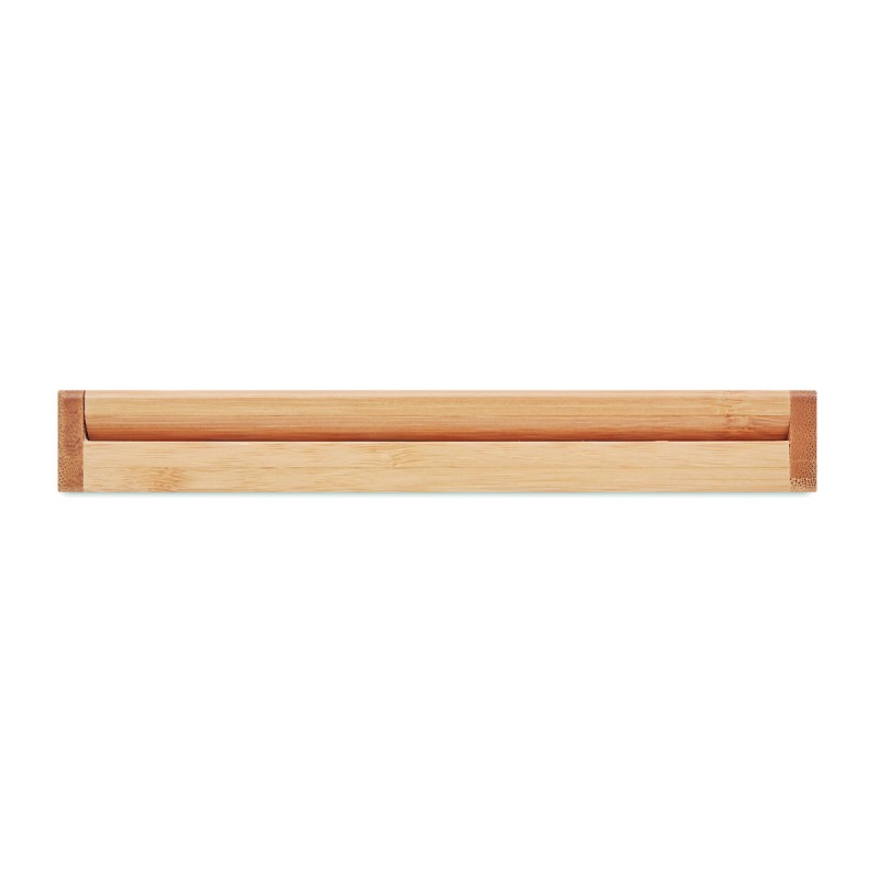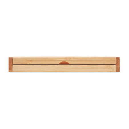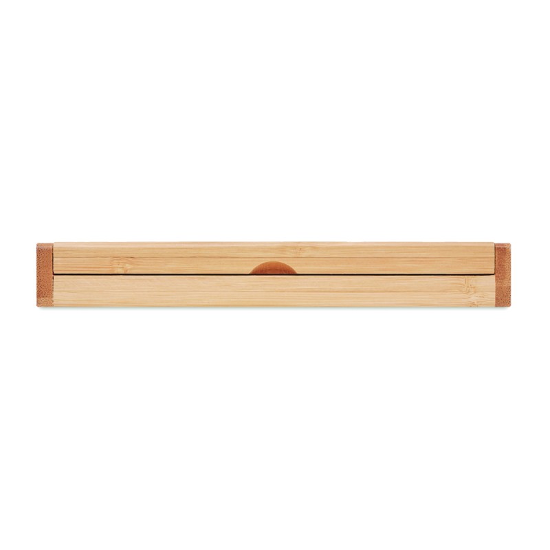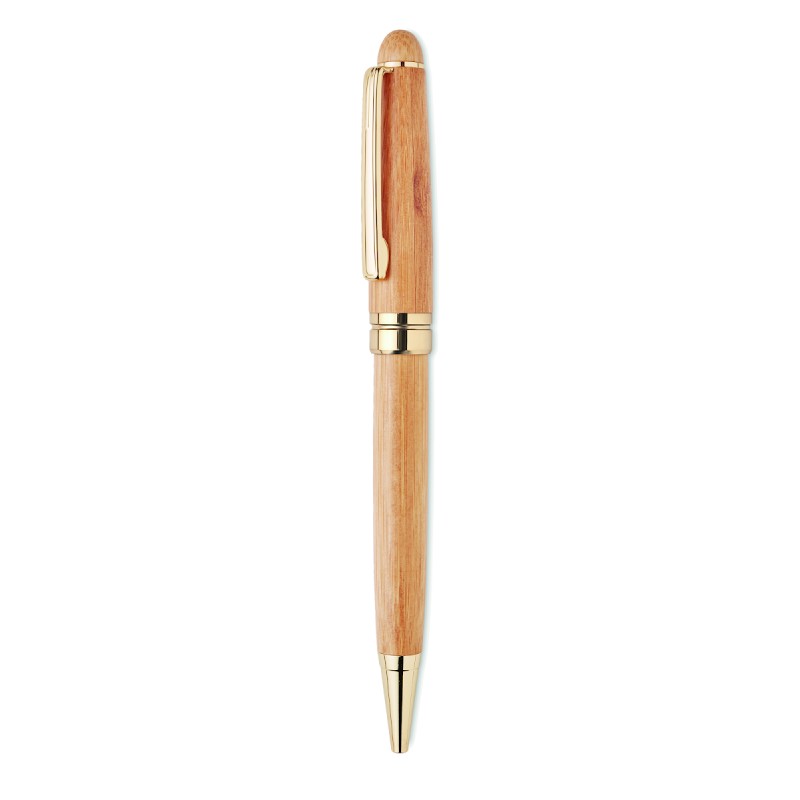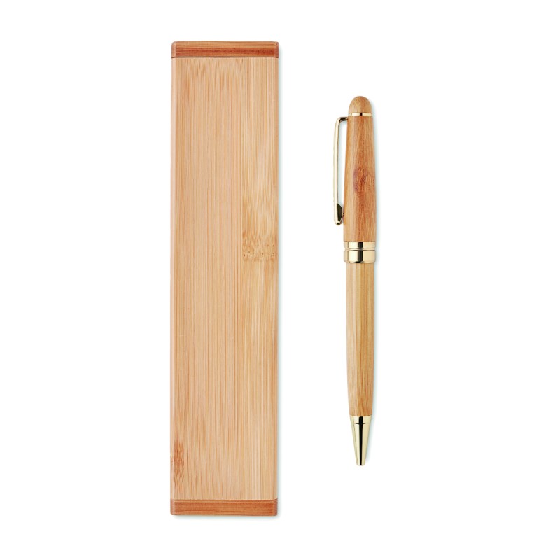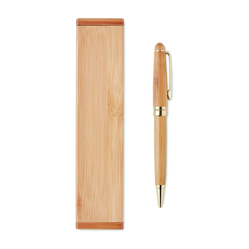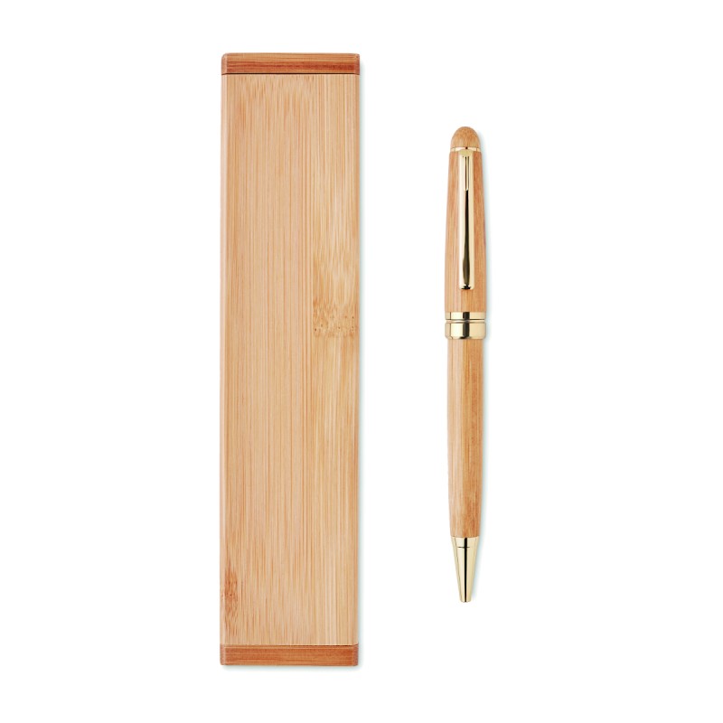 Coffret cadeau avec stylo à bille torsadée dans une boîte en bambou. Encre bleue. Le bambou est un produit naturel, il peut y avoir de légères variations de couleur et de taille par article, ce qui peut affecter le résultat final de la décoration.