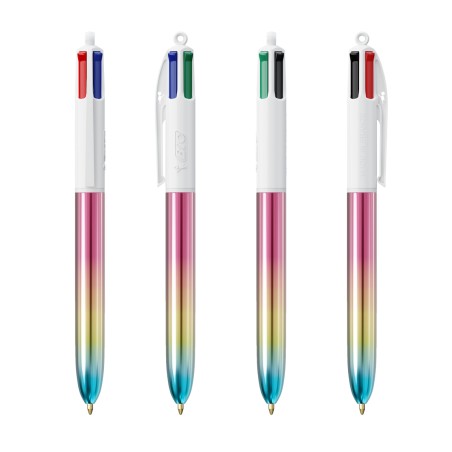 Découvrez notre nouveau BIC® 4 Couleurs® Gradient ! Son effet dégradé métallique unique combine 3 couleurs brillantes sur le corps, pour des vibrations estivales et une créativité sans limite ! Nos stylos à bille BIC® 4 Couleurs® ont une longueur d'écriture moyenne de 8.000m (tests SGS - longueur d'écriture moyenne pour les cartouches bleue, noire, rouge et verte). Notre emblématique BIC® 4 Couleurs® devient plus durable, avec désormais 13 % de plastique en moins dans la partie supérieure ! Entre juin 2023 et juin 2024, il est possible que vous receviez votre commande avec le clip standard ou le nouveau clip contenant moins de plastique.