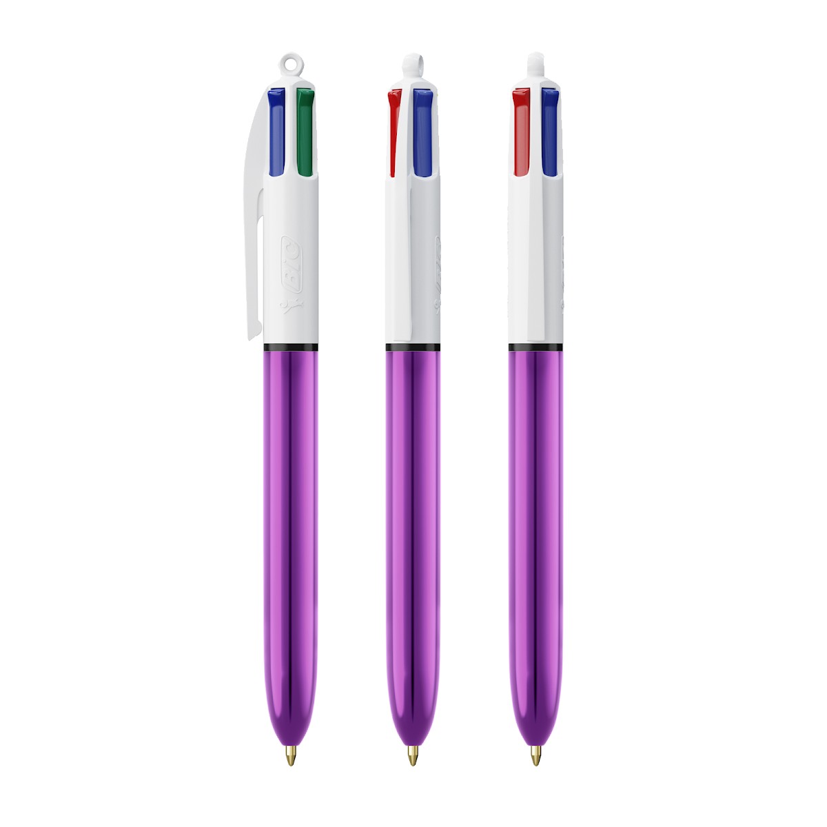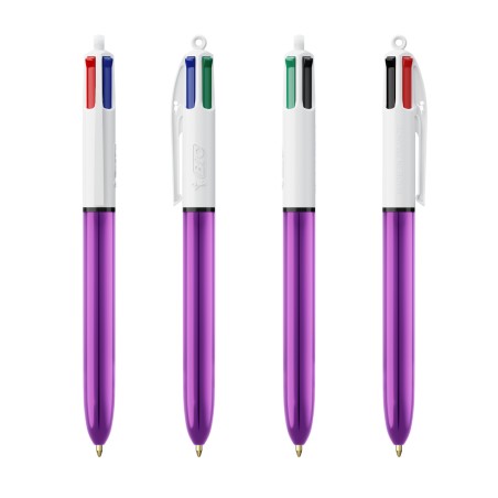 Le célèbre BIC® 4 couleurs, icône de la marque, présenté dans des couleurs métallisées brillantes. Disponible dans 4 couleurs d'encre standard : bleu, noir, rouge et vert. Notre emblématique BIC® 4 Couleurs® devient plus durable, avec désormais 13 % de plastique en moins dans la partie supérieure ! De juin 2023 à juin 2024, veuillez retenir que vous pouvez recevoir votre ligne de commande avec le clip standard ou le nouveau clip contenant moins de plastique.