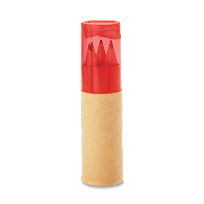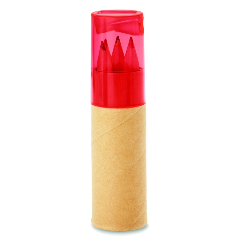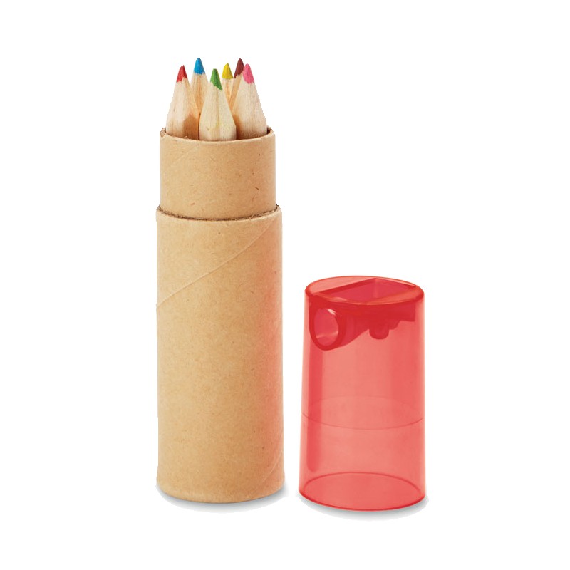 6 crayons de couleurs dans un tube en carton recyclé avec taille crayon intégré dans le capuchon.