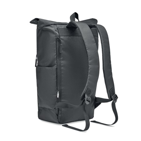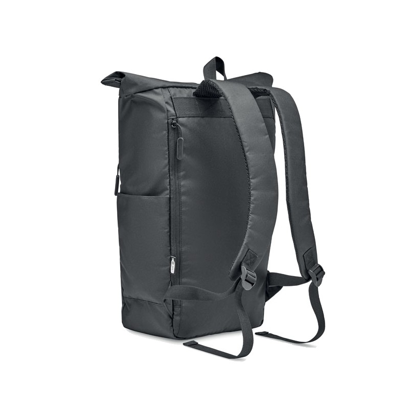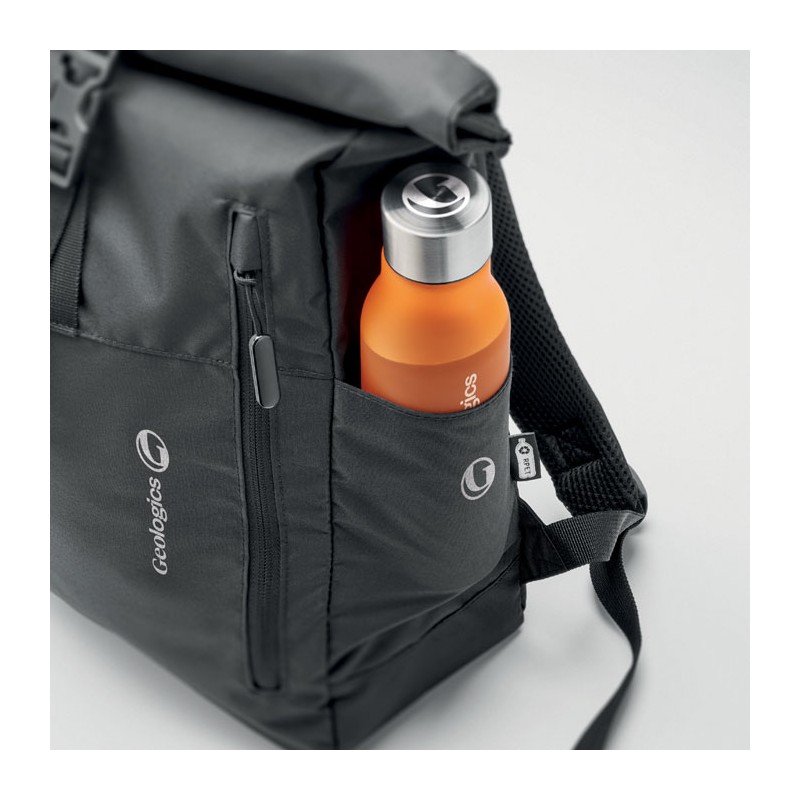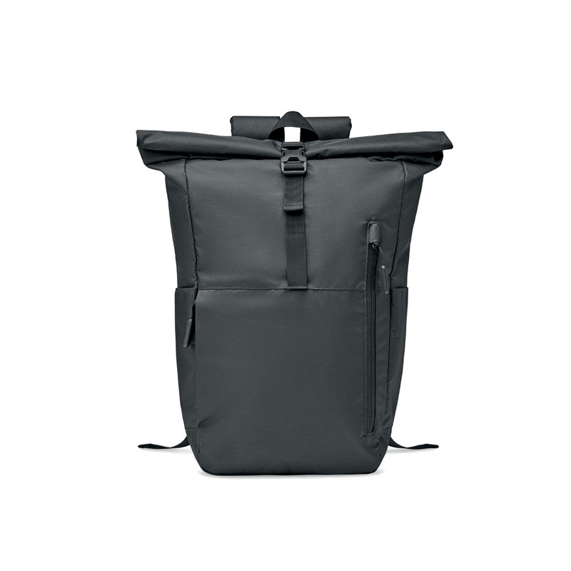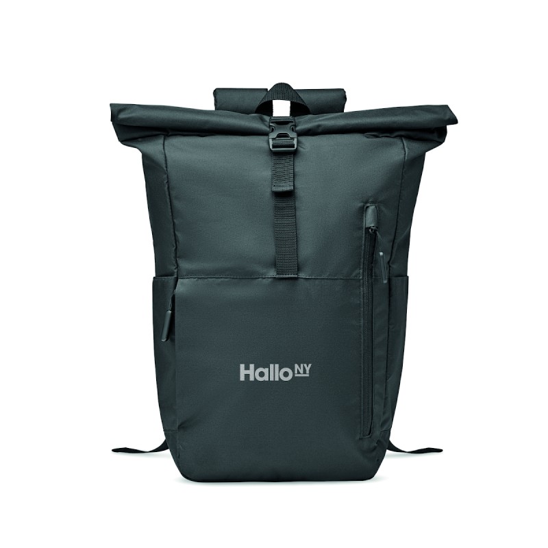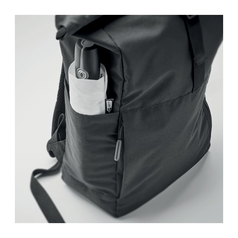 Sac à dos fermeture enroulable pour ordinateur portable de 15 pouces en polyester 300D RPET. Grande poche frontale zippée et une poche latérale secrète avec mousqueton à l'intérieur.