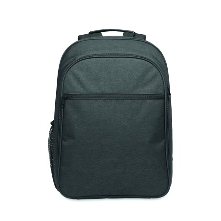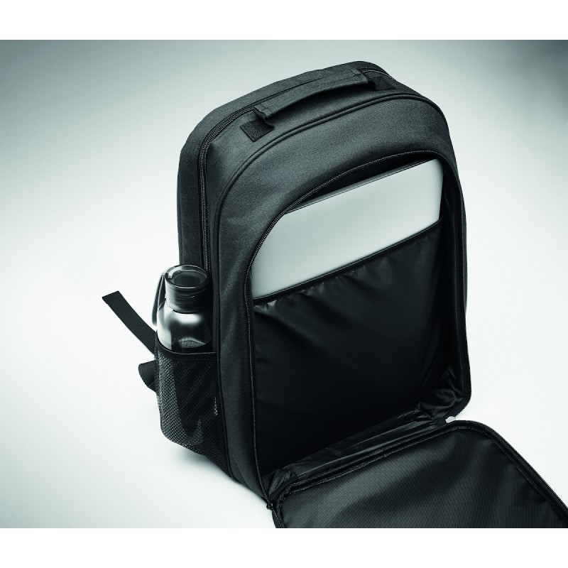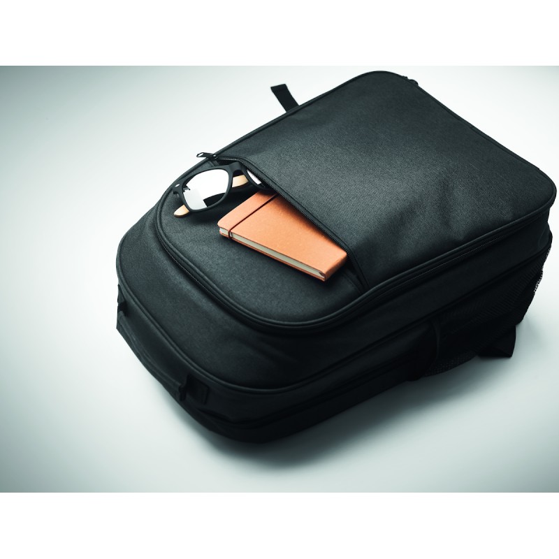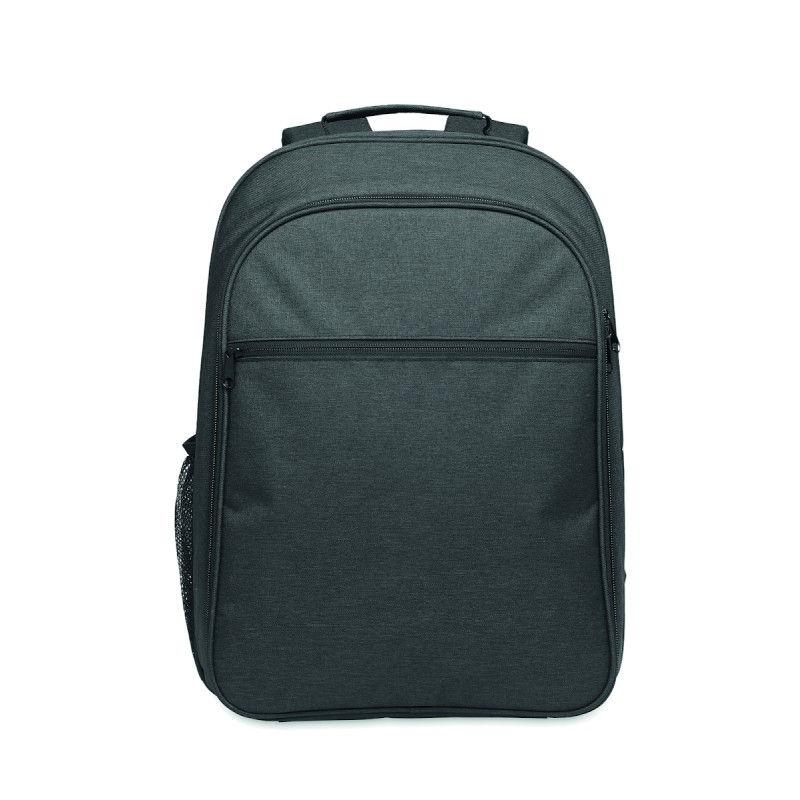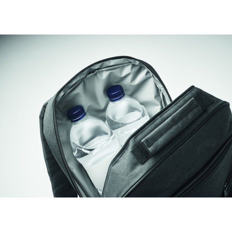 Sac à dos isotherme en 300D RPET avec compartiment pour ordinateur portable de 15 pouces. Poche frontale zippée et un compartiment latéral en filet.