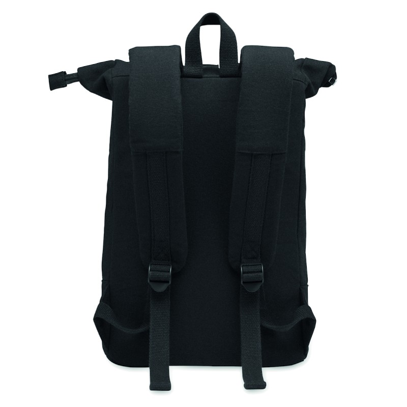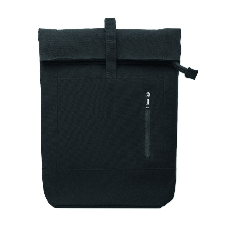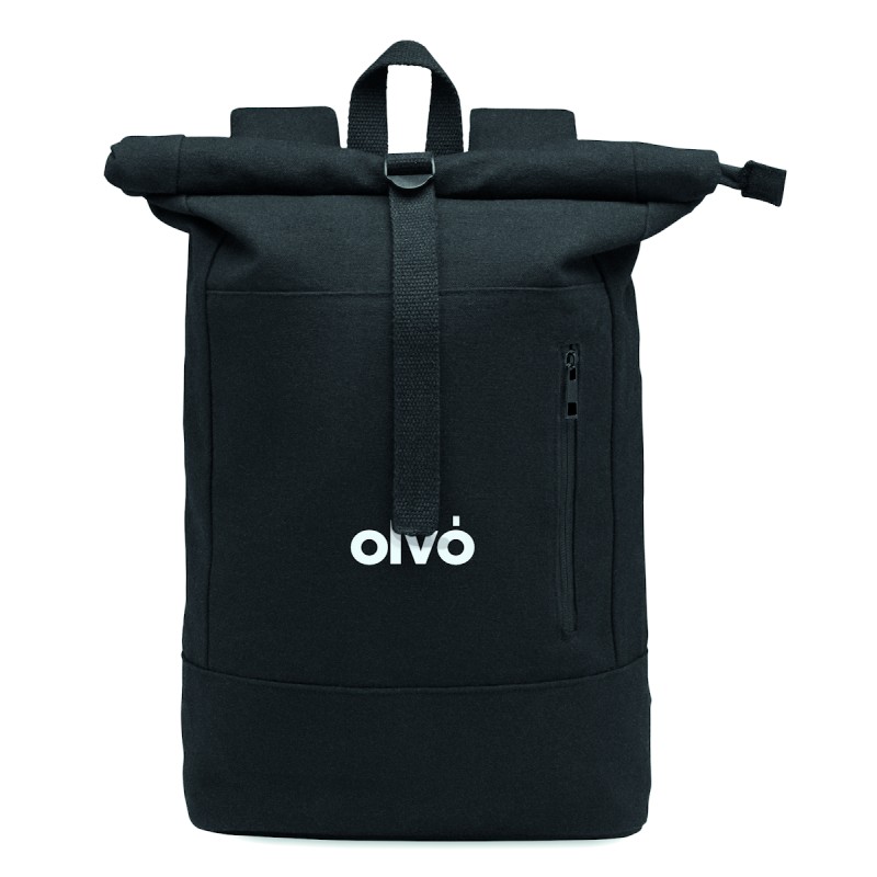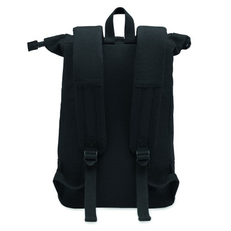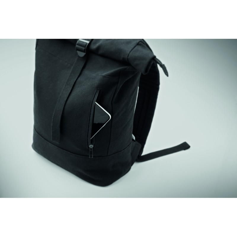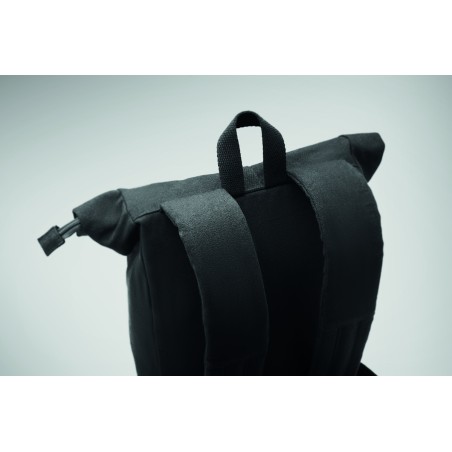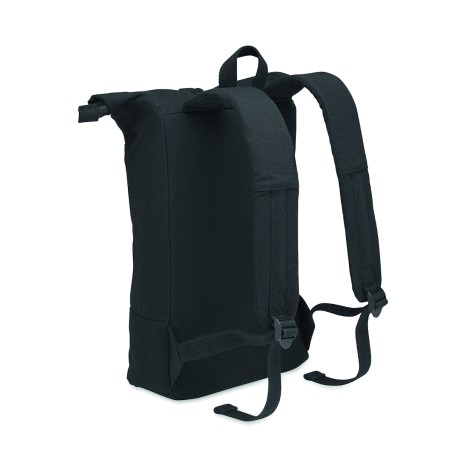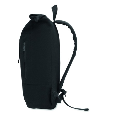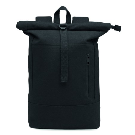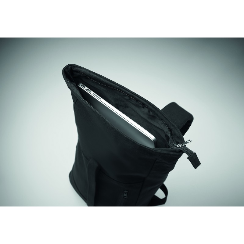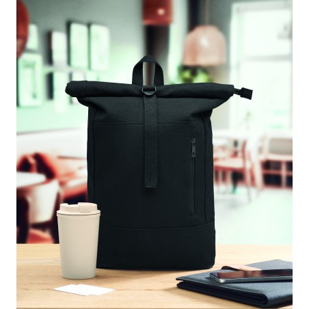 Sac à dos à ftop enroulable zippé pour ordinateur portable de 15 pouces en coton recyclé de préconsommation et polyester recyclé (70 %/30 %). Poche frontale zippée. Dos et bretelles rembourrés. 340gr/m².