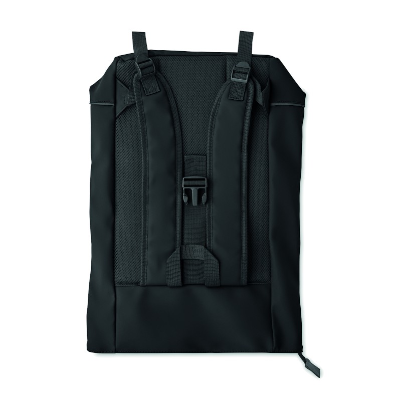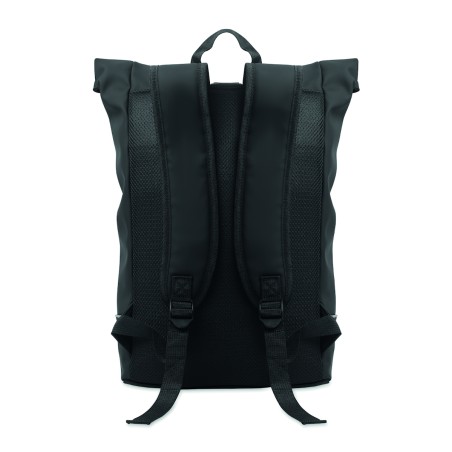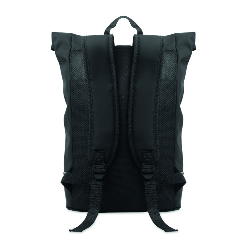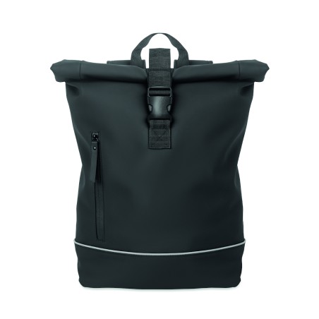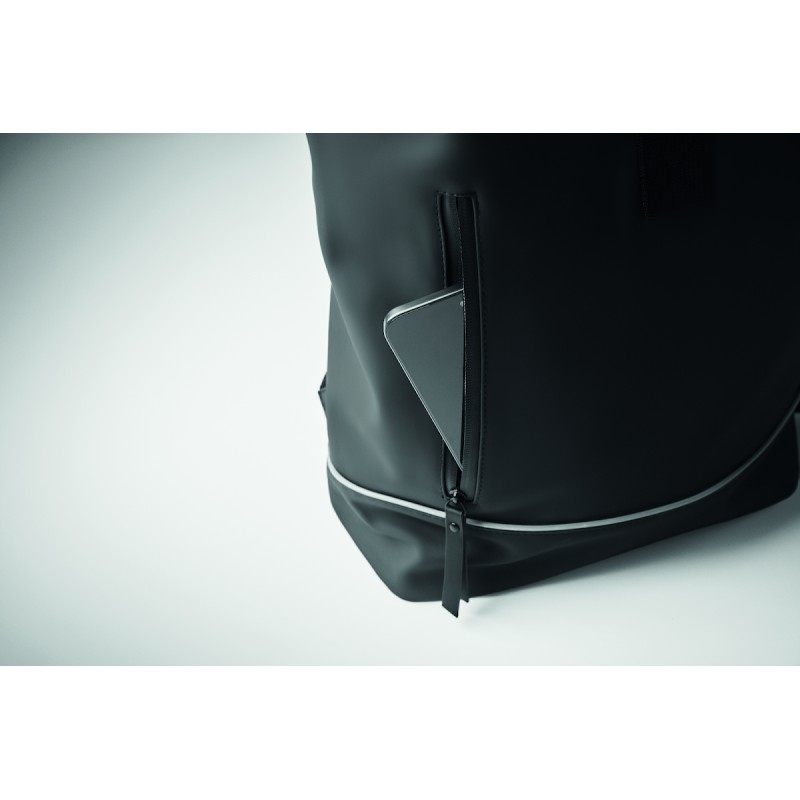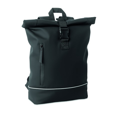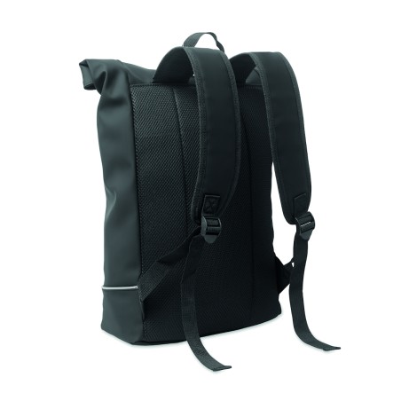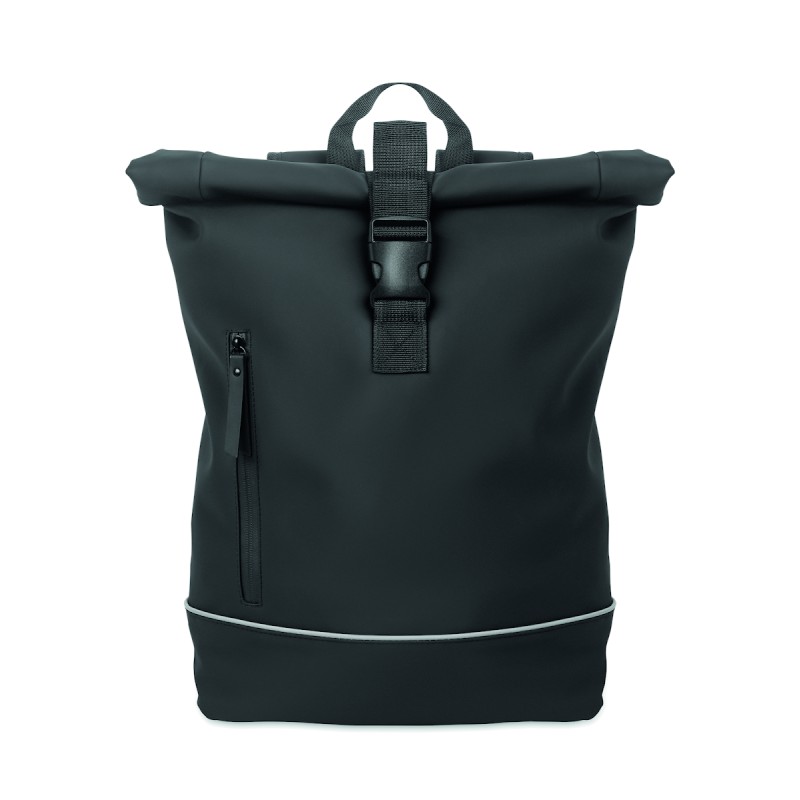 Sac à dos enroulable pour ordinateur portable 15 pouces en PU souple avec dos rembourré, base renforcée et bande réfléchissante. Poche frontale étanche avec fermeture éclair. doublure en polyester 210D RPET.