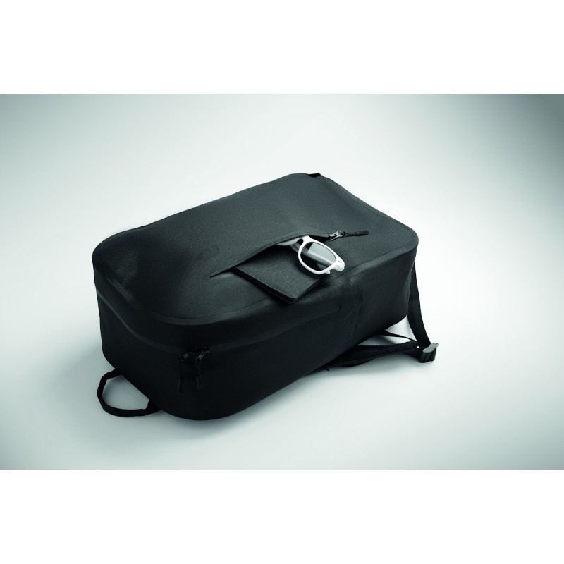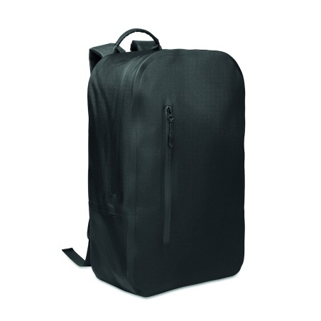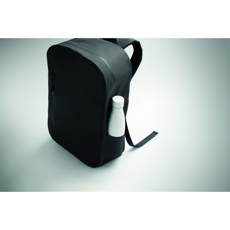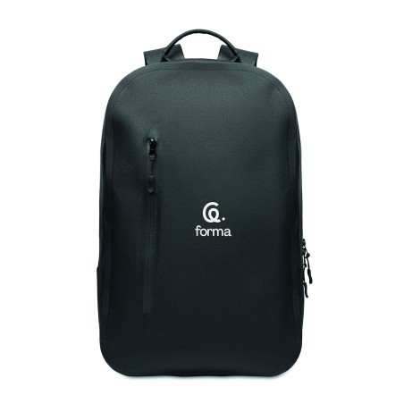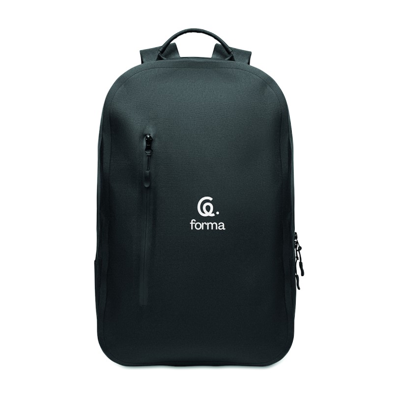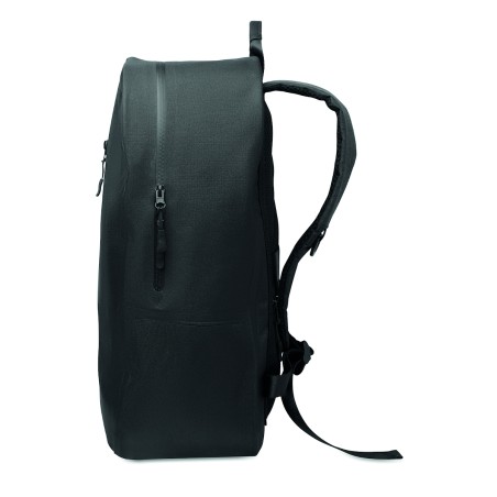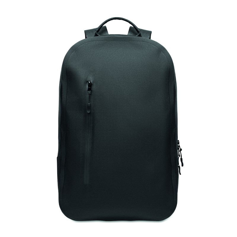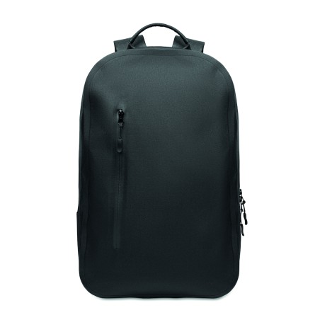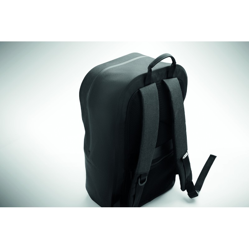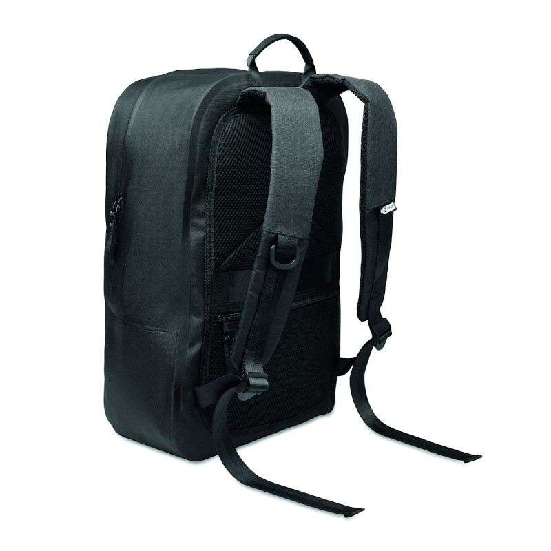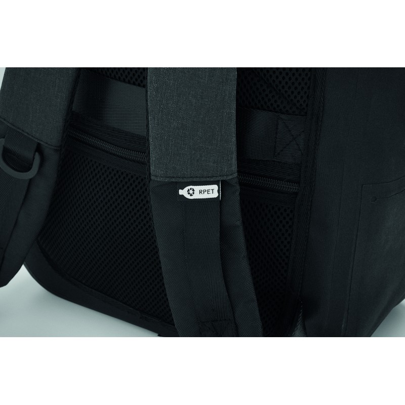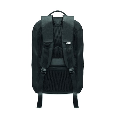 Sac à dos pour ordinateur portable 16'' en polyester 300D RPET et doublure en polyester 210D. Tissu résistant à l'eau. Poche cachée zippée et passant pour trolley au dos. Compartiment interne renforcé, dos en filet et bandoulière.