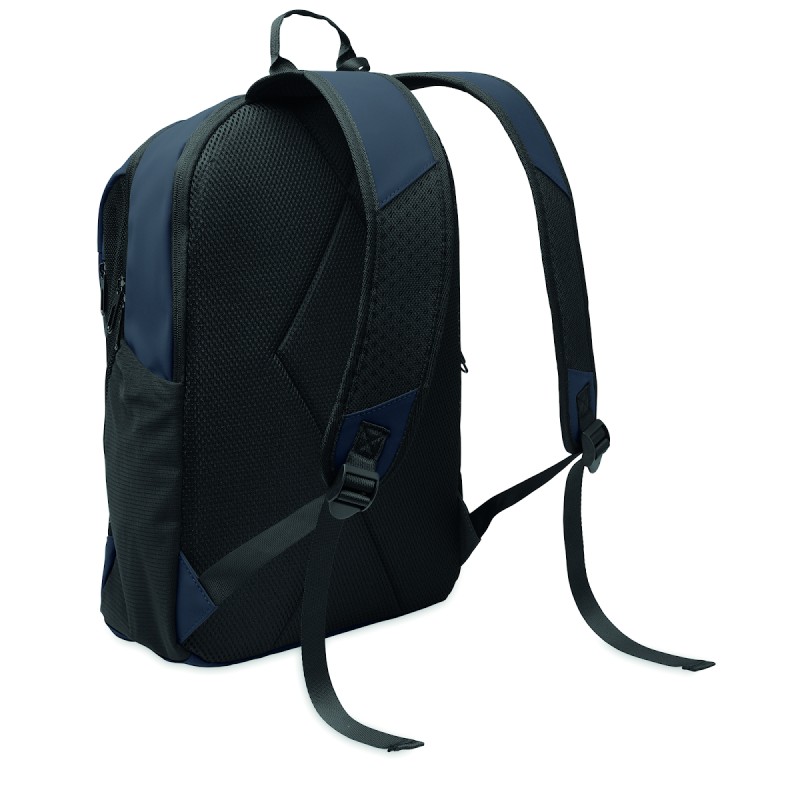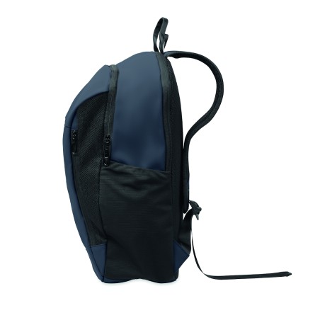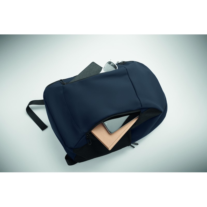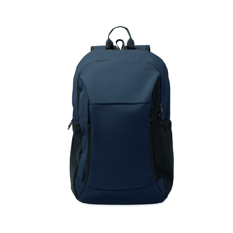 Sac à dos pour ordinateur portable de 15'' en PU souple avec dos rembourré et compartiment principal caché avec zip. 1 poche frontale zippée, 2 poches latérales zippées et 2 poches latérales en maille élastique. Doublure en RPET 210D.