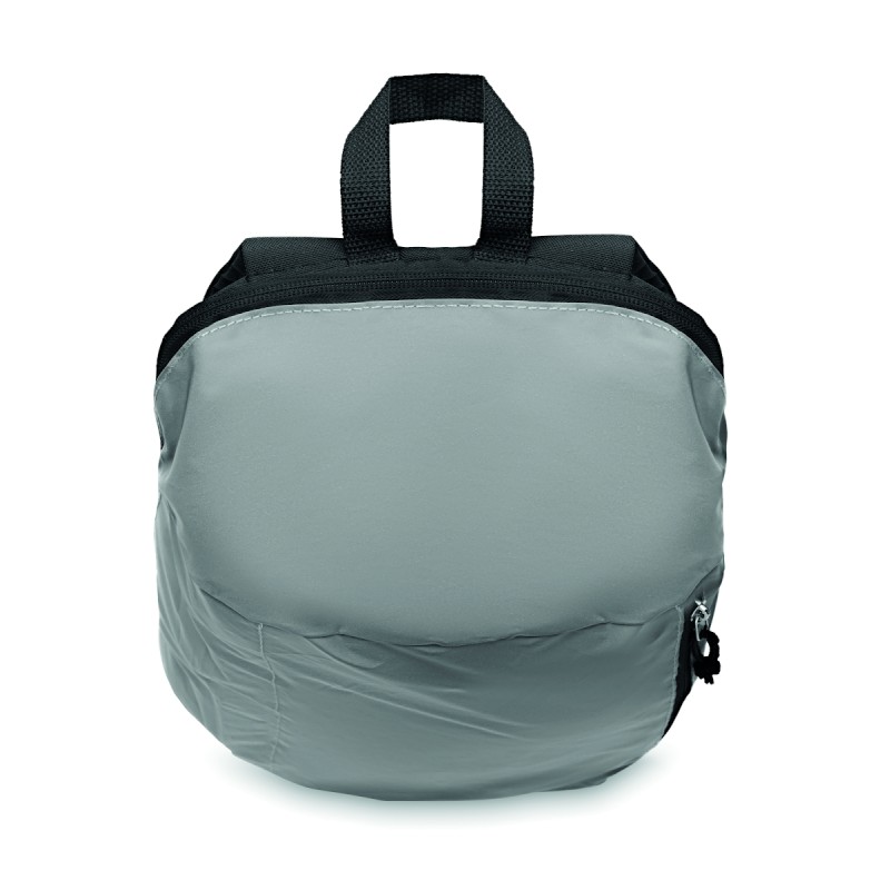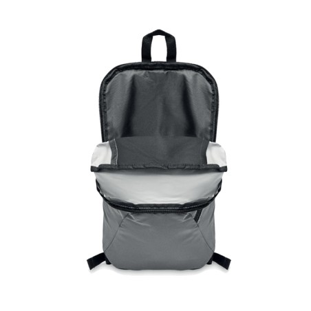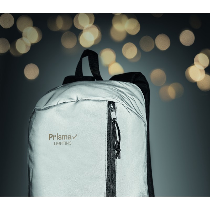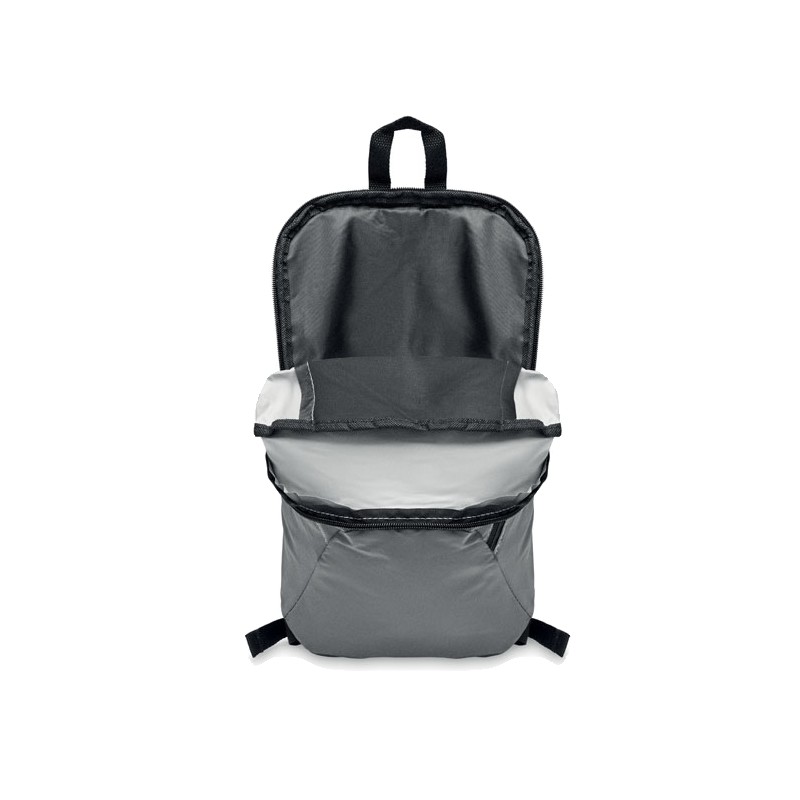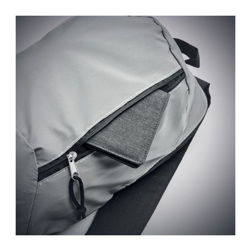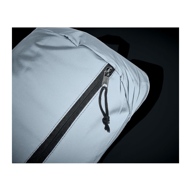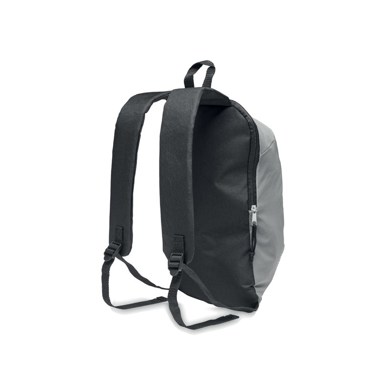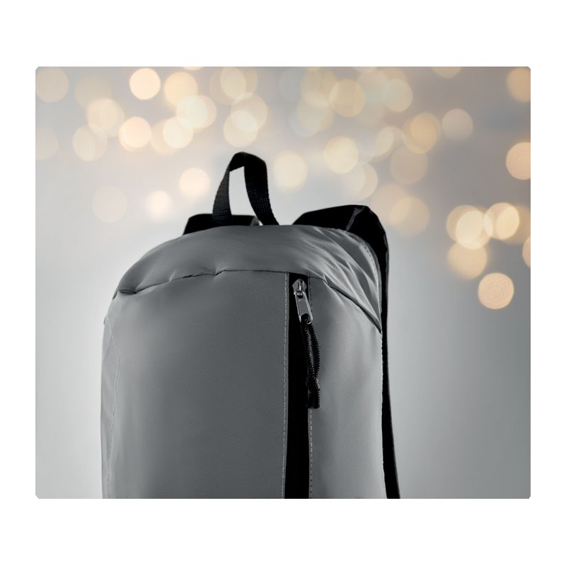 Sac à dos avec le devant en polyester hautement réfléchissant, une poche extérieure zippée et pour plus de confort une partie arrière rembourrée en polyester 600D.