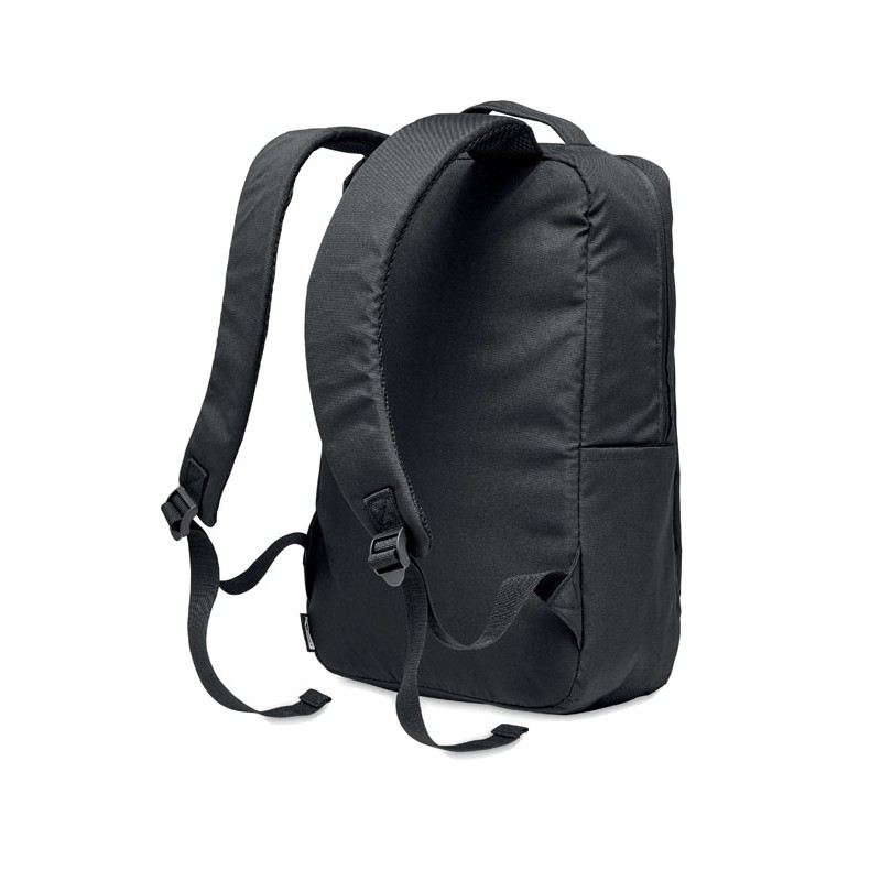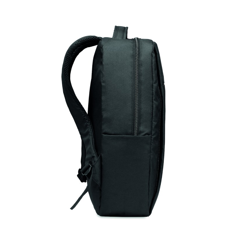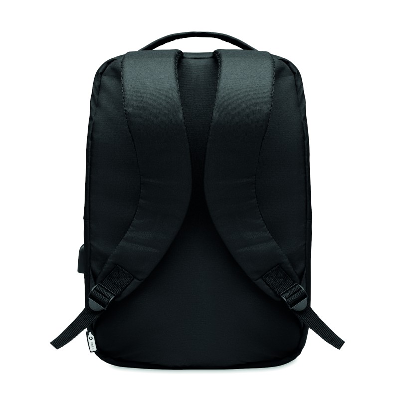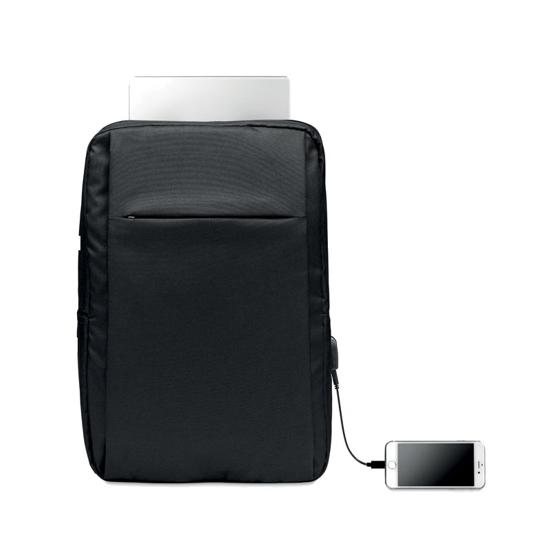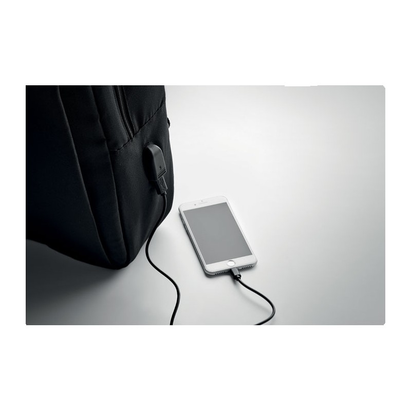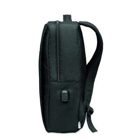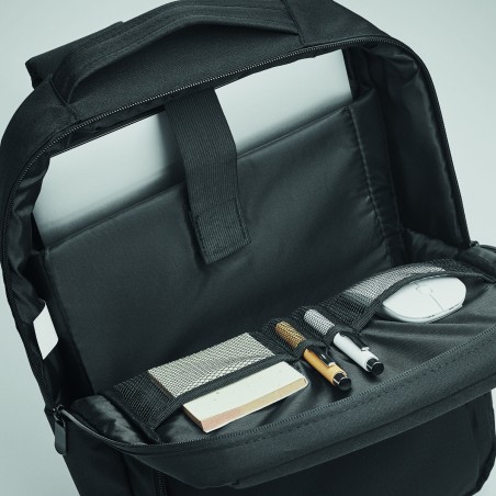 Sac à dos pour ordinateur en polyester RPET 300D avec bandoulière rembourrée comprenant un compartiment interne principal pour un ordinateur portable de 16 pouces et un câble de chargement USB.