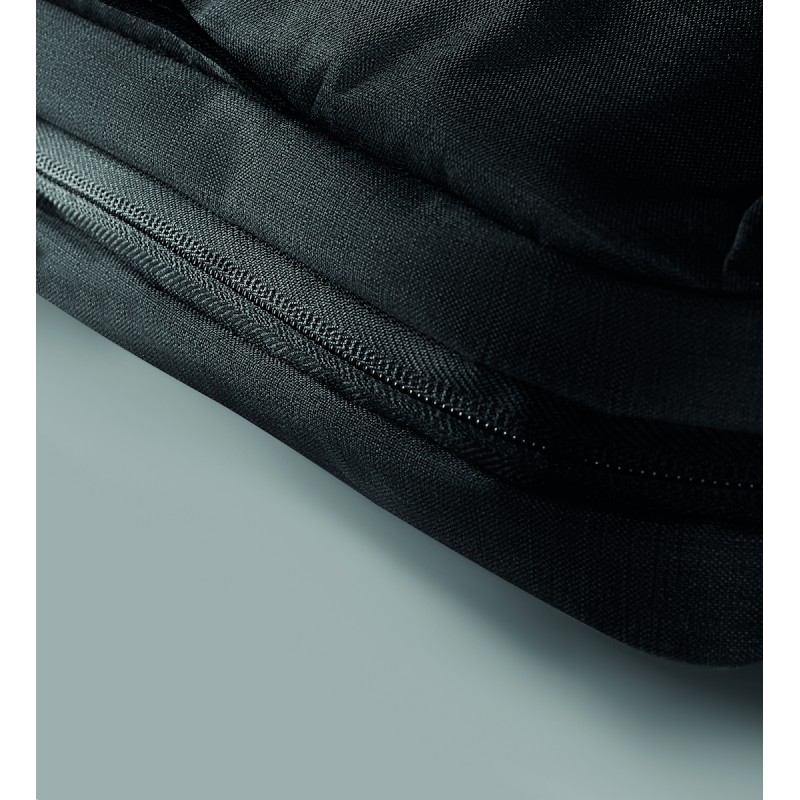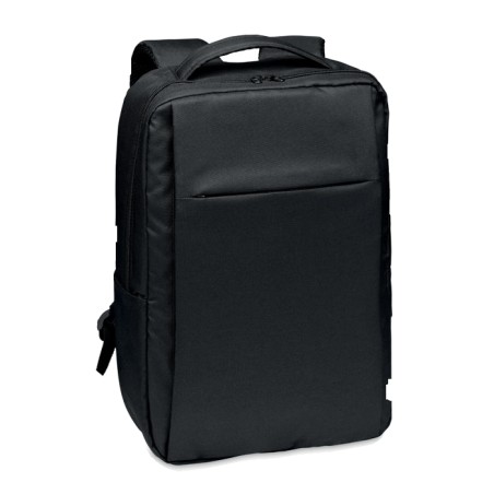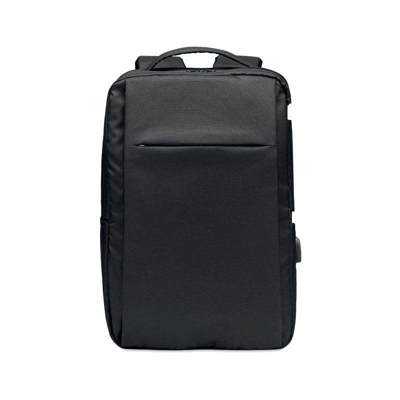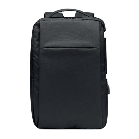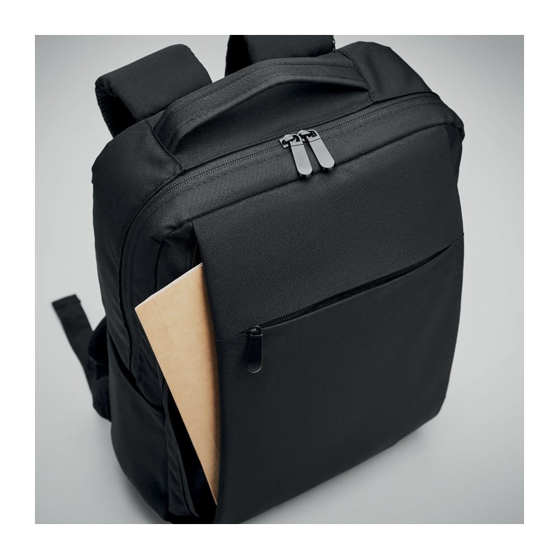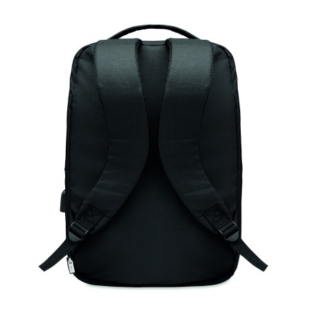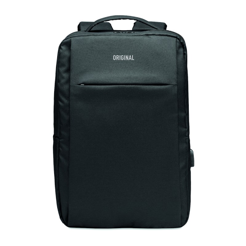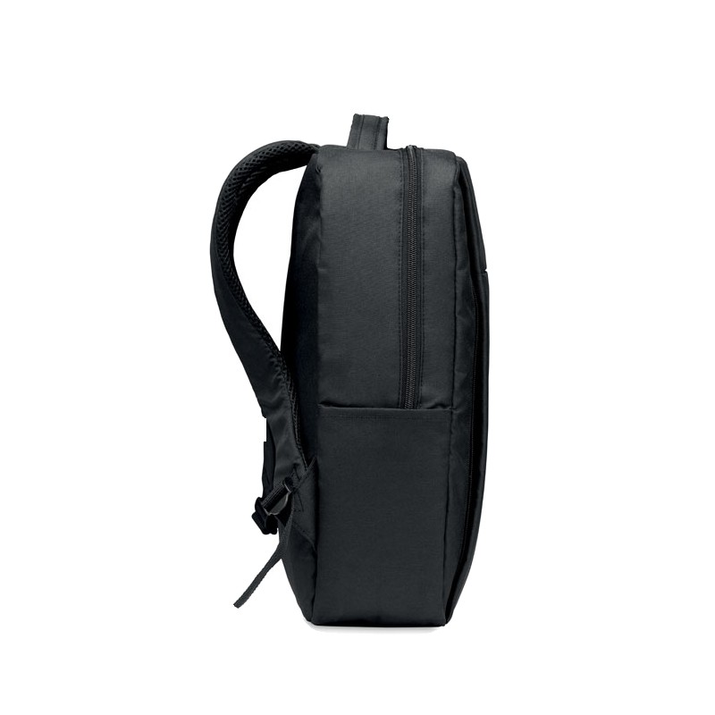 Sac à dos pour ordinateur en polyester RPET 300D avec bandoulière rembourrée comprenant un compartiment interne principal pour un ordinateur portable de 16 pouces et un câble de chargement USB.