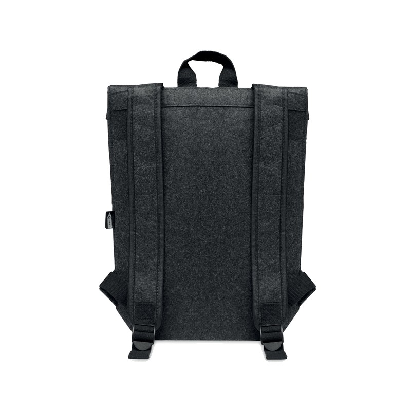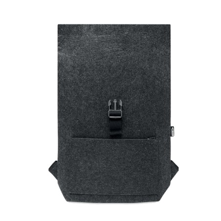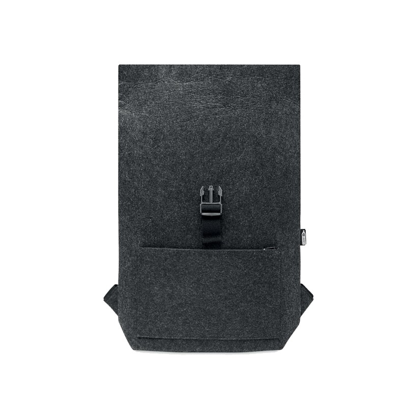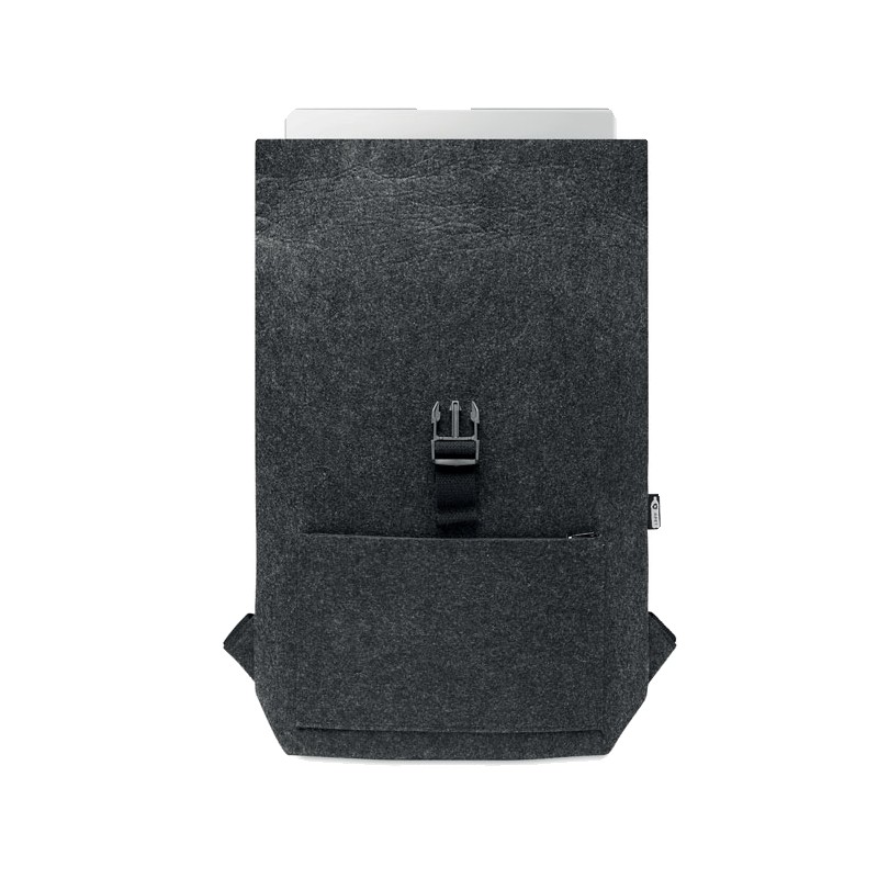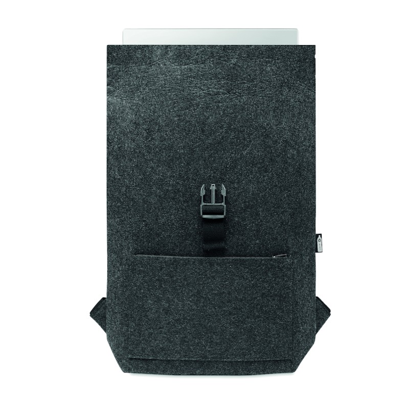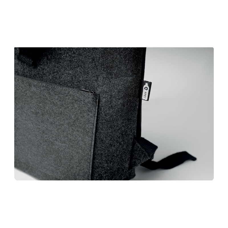 Sac à dos en feutre RPET avec sangle de fermeture en coton et pochette zippée sur le devant. Il possède un compartiment pour ordinateur portable.