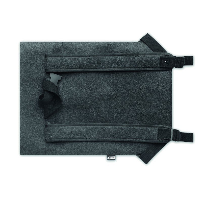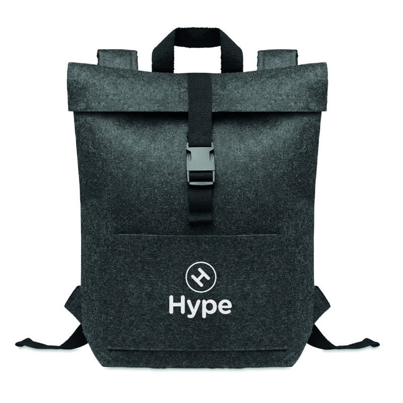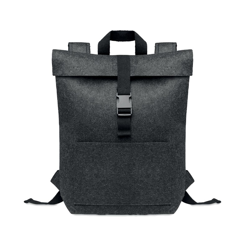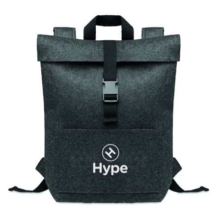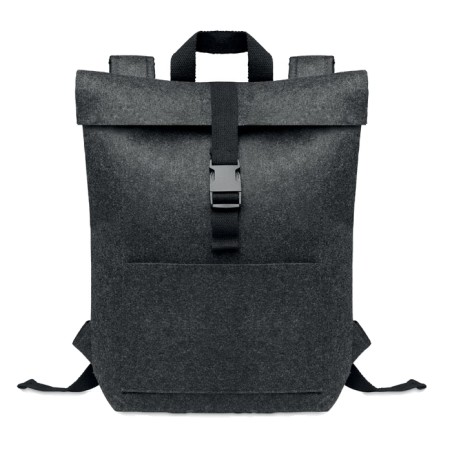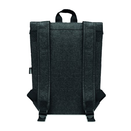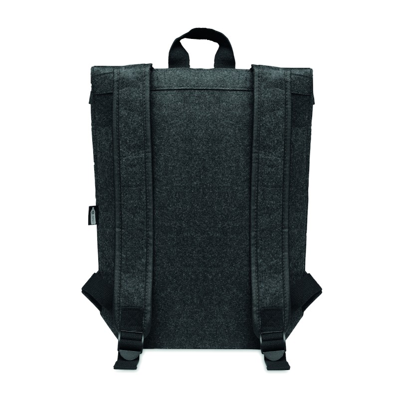 Sac à dos en feutre RPET avec sangle de fermeture en coton et pochette zippée sur le devant. Il possède un compartiment pour ordinateur portable.