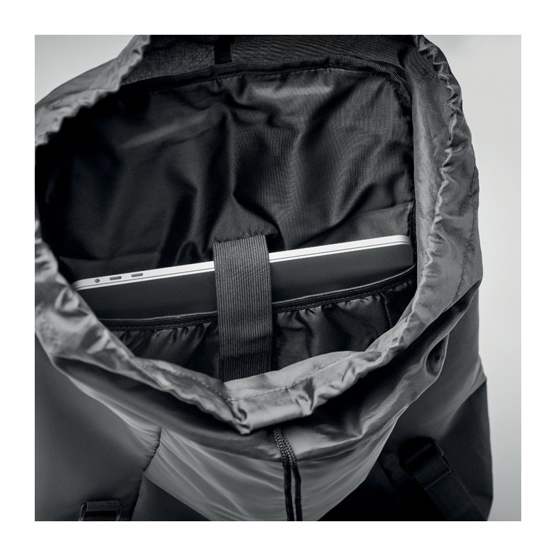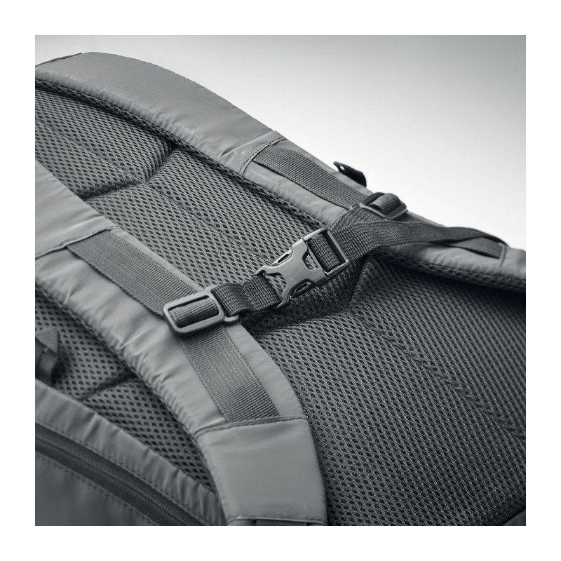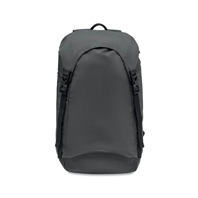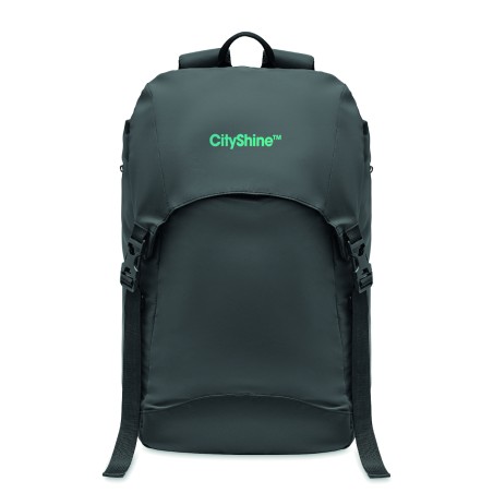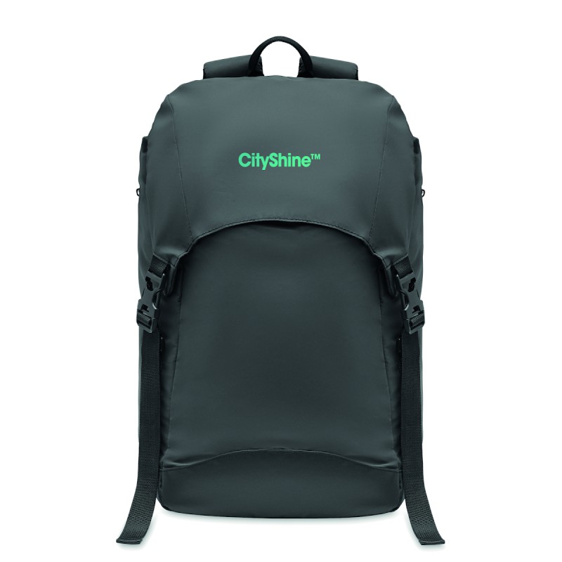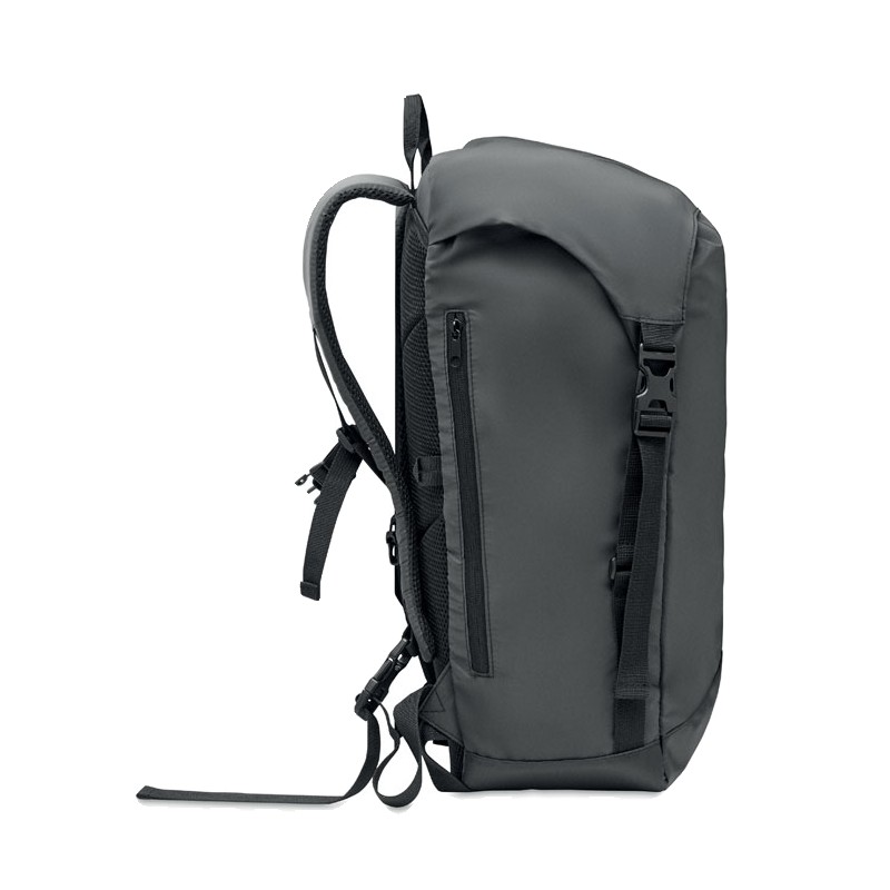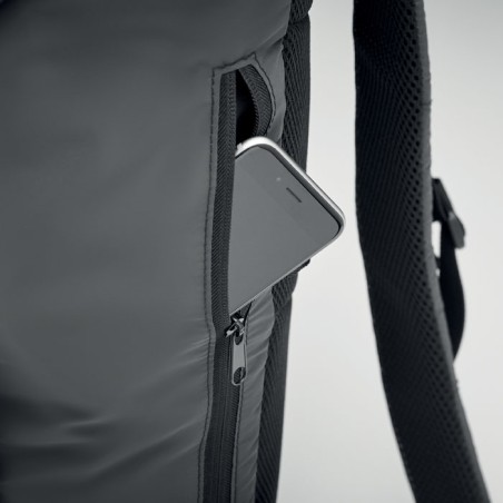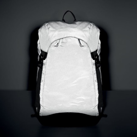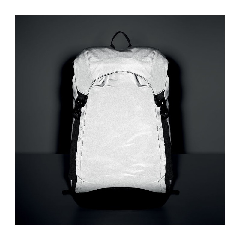 Sac à dos en polyester 190T enduit de granulés réfléchissants. Poche extérieure latérale zippée et dos rembourré, doublure intérieure avec cordon de serrage. Un compartiment intérieur et bretelles rembourrés, une sangle de poitrine et de taille réglable. Déperlant.