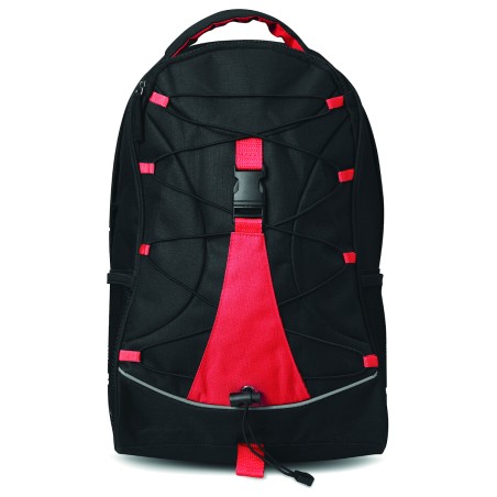 Sac à dos noir avec façade en couleur contrastée. Polyester 600D. Cordon de décoration sur le devant. Poches filet sur les deux côtés.