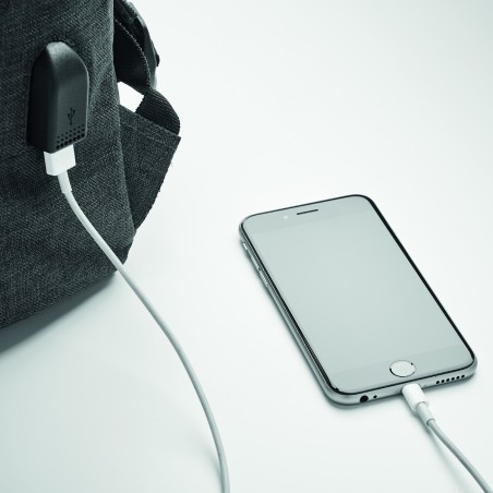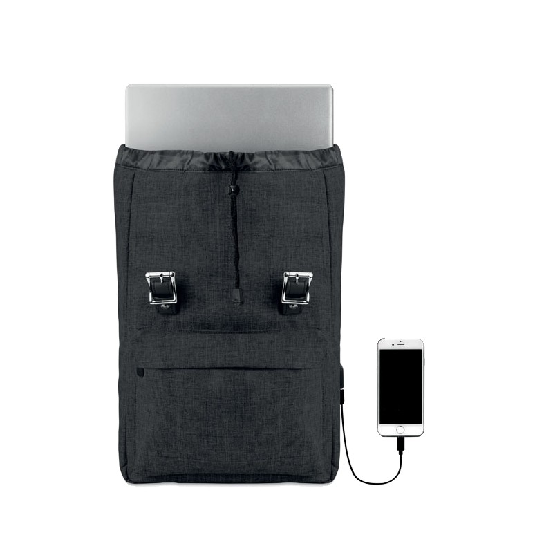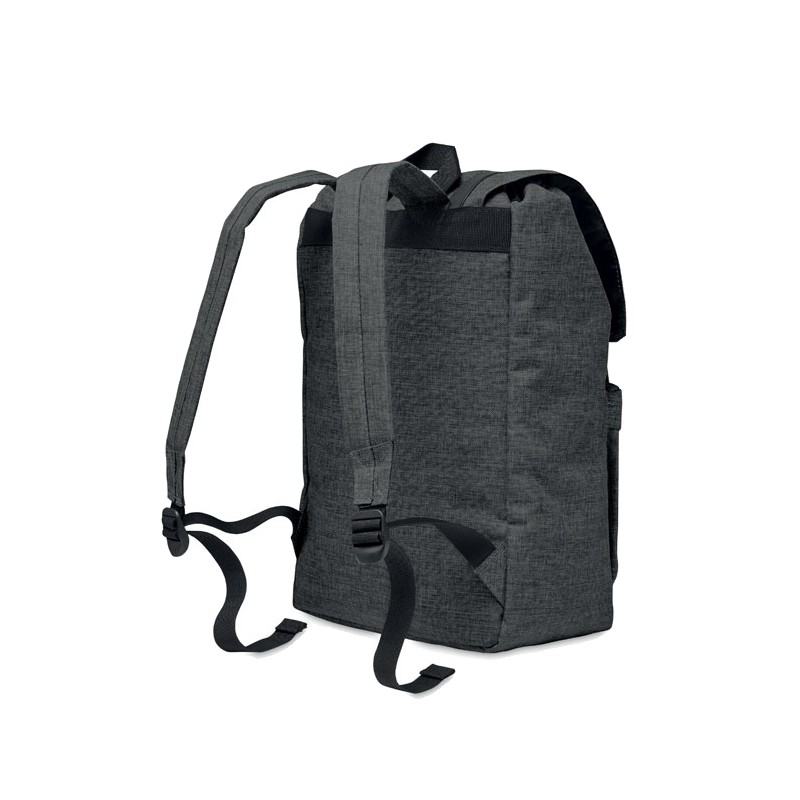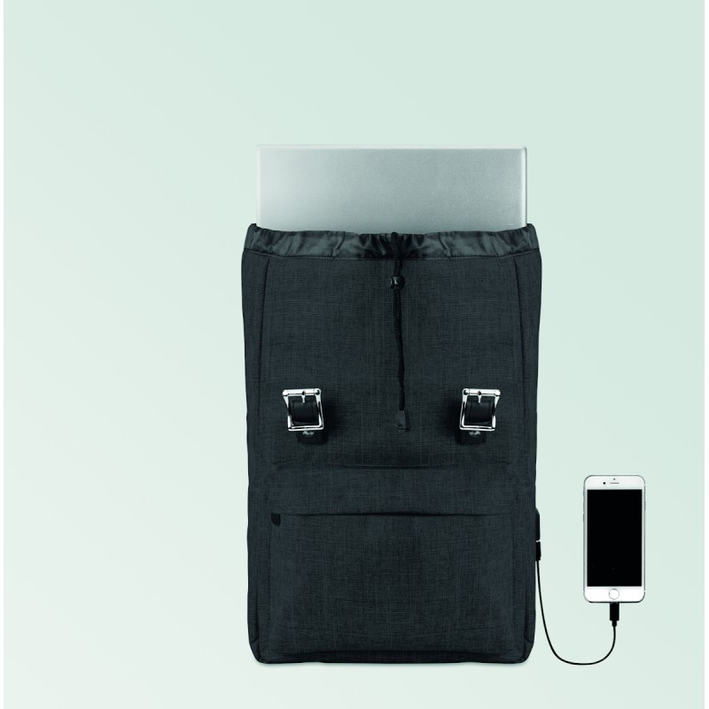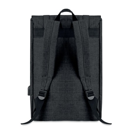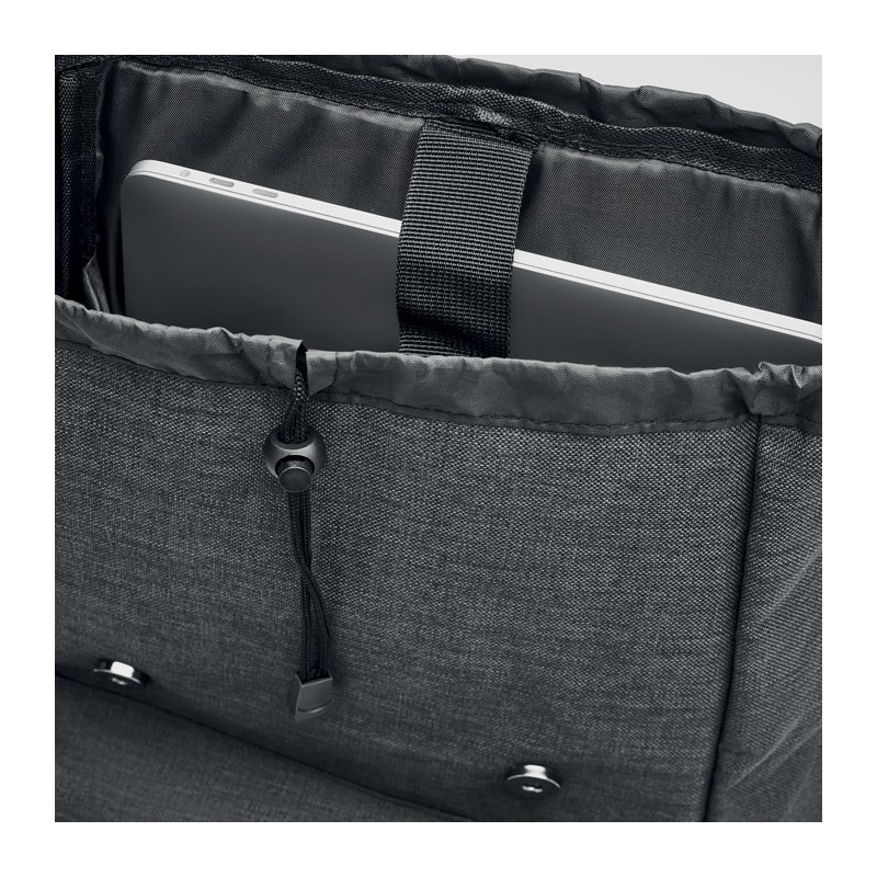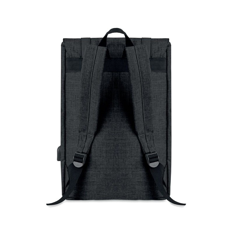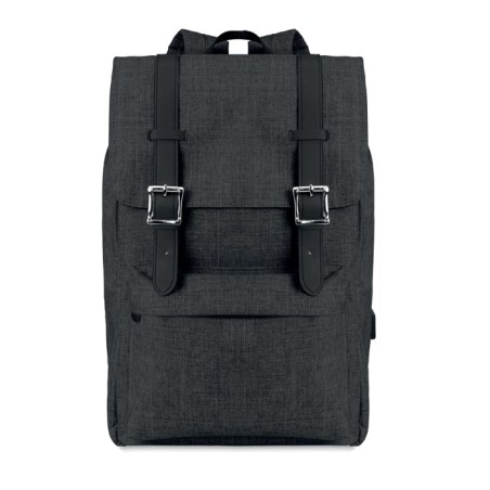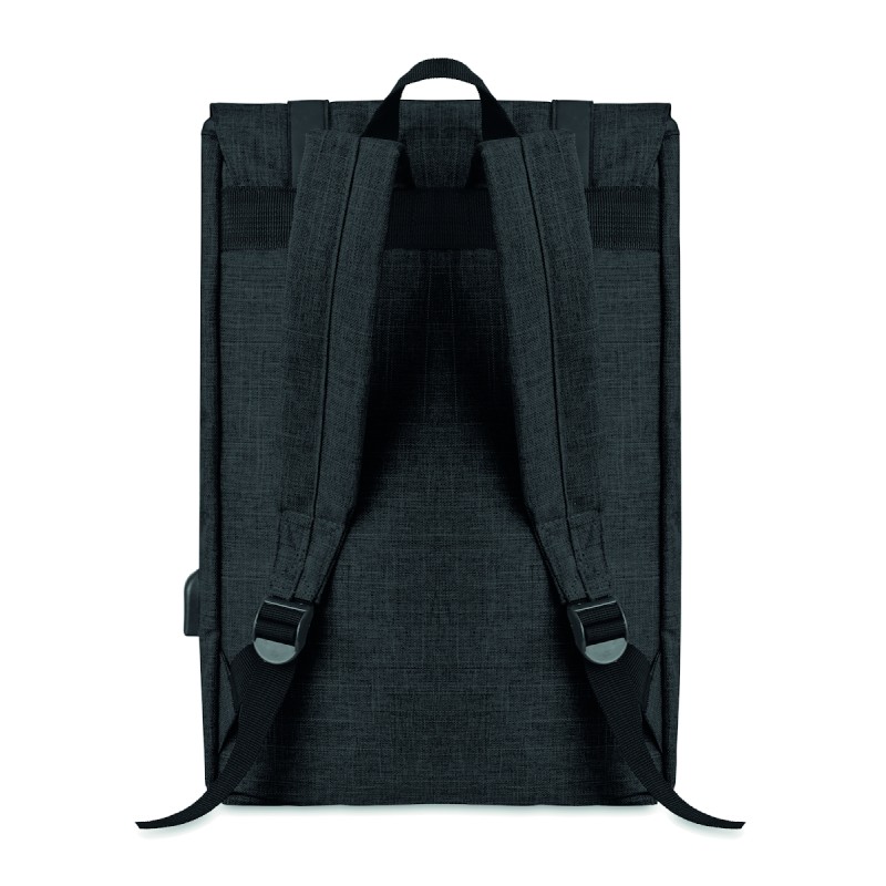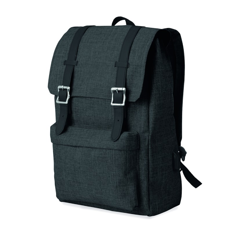 Sac à dos ordinateur en polyester 600D 2 tons avec bandoulière rembourrée comprenant un compartiment interne principal pour ordinateur portable de 15 pouces et un câble de chargement USB. Comprend une fermeture à bouton-pression magnétique et un compartiment avant à glissière.