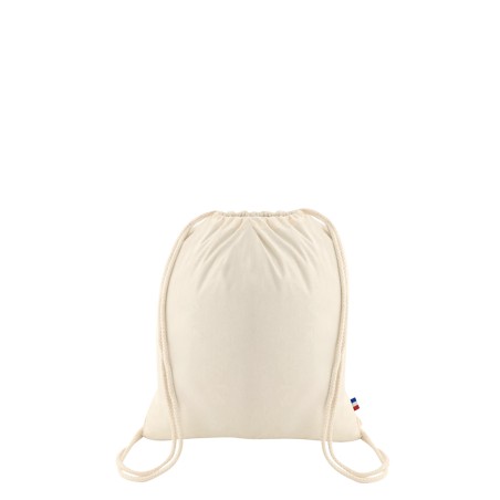 Sac à dos Fabien écru certifié GOTS, dimensions 38x42cm, Confection France, en 100% coton BIO - tissé France, avec 2 cordons de 8mm d'épaisseur. Étiquette intérieure de composition avec logo Bonjour François, galon BBR sur le coté du sac. 250 pièces par carton. Toile 150g/m².