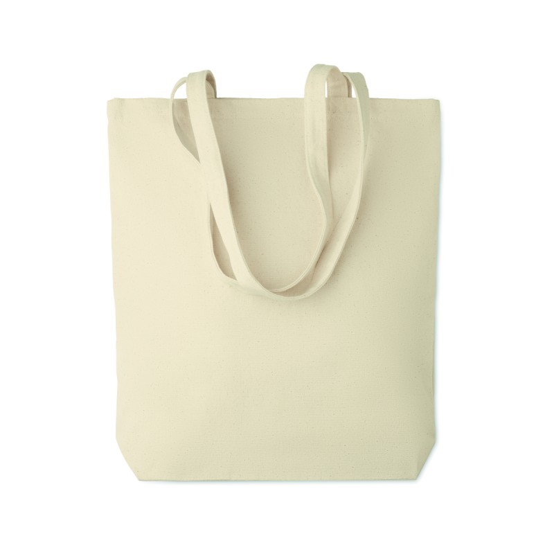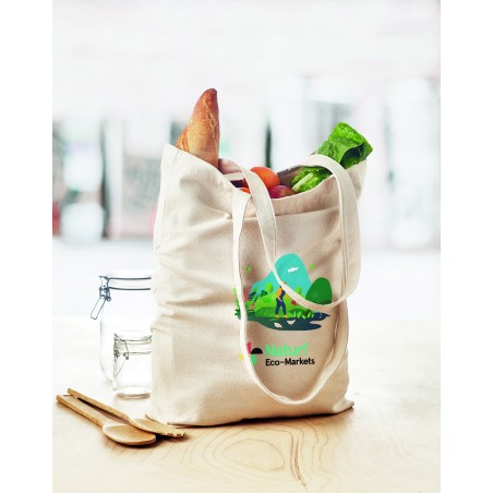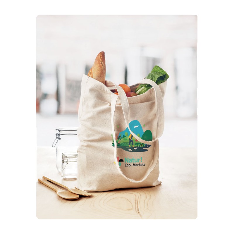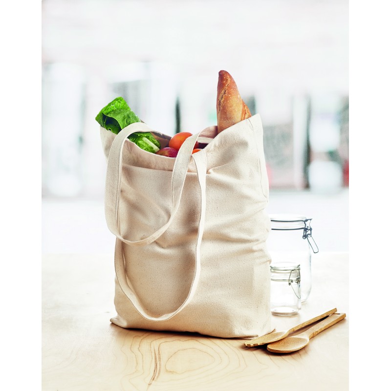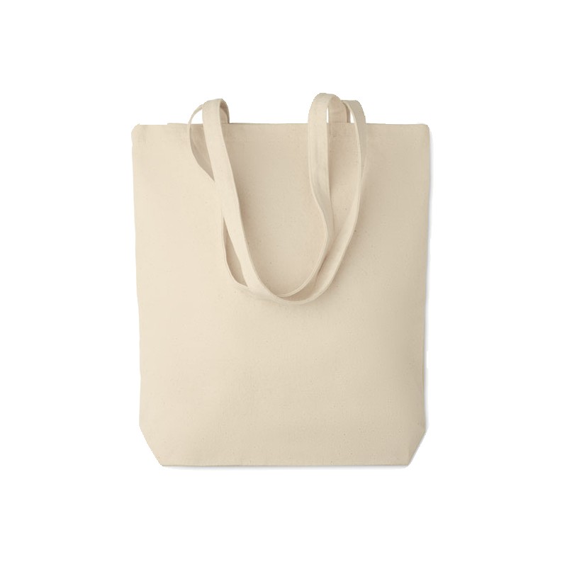 Sac shopping en toile à anses longues et à soufflet de fond. Un sac idéal pour vos courses quotidiennes. Les longues poignées permettent de le porter facilement, soit en le tenant, soit en le portant à l'épaule. Ce cabas en toile possède un soufflet sur le fond, ce qui vous permet de transporter plus d'articles qu'avec un sac de forme normale standard. 270 gr/m². Ce produit est certifié OEKO-TEX® STANDARD 100.