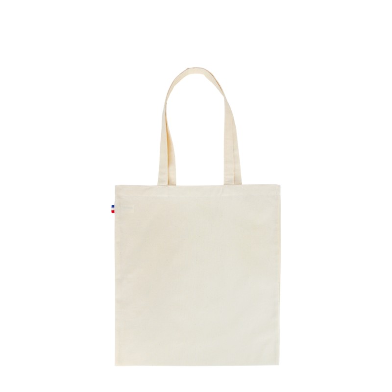 Tote bag François, dimensions 38x42cm, Confection France (atelier BF ou ESS), en 100% coton, avec anses de 2,5x60cm. Étiquette intérieure de composition avec logo Bonjour François, galon BBR sur le coté du sac. 250 pièces par carton. Toile 150g/m².