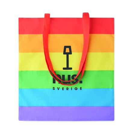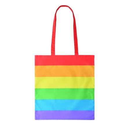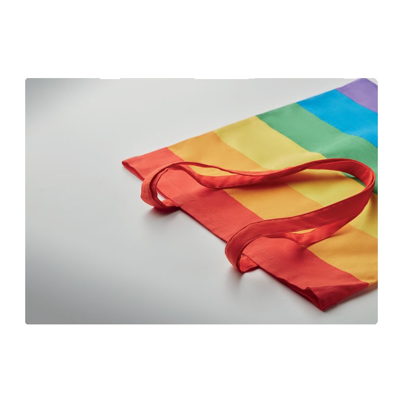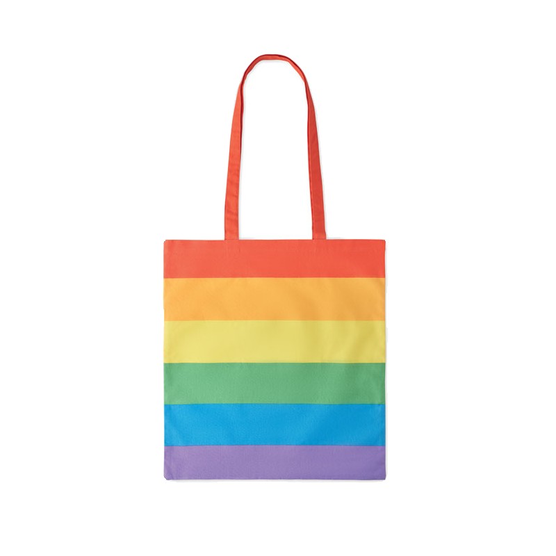 Sac à provisions en coton arc-en-ciel de 200 gr/m² avec de longues anses. Ajoutez de la couleur à votre marque ou à votre message spécial avec ce sac fourre-tout joyeux. Ce sac est idéal pour les courses quotidiennes. Vous pouvez le porter par les longues poignées ou le suspendre à votre épaule pour garder les mains libres. Poids maximal supporté 2,5 kg. Ce produit est certifié OEKO-TEX® STANDARD 100.