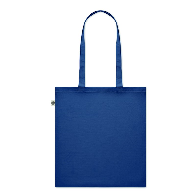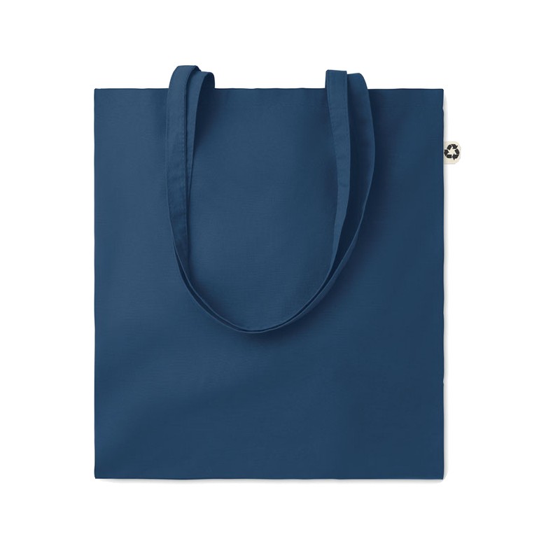 Sac shopping en coton recyclé post-consommation (65% coton recyclé, 35% coton ordinaire) avec de longues anses. 140 gr/m².