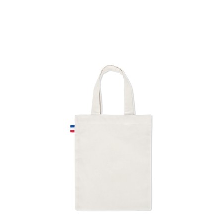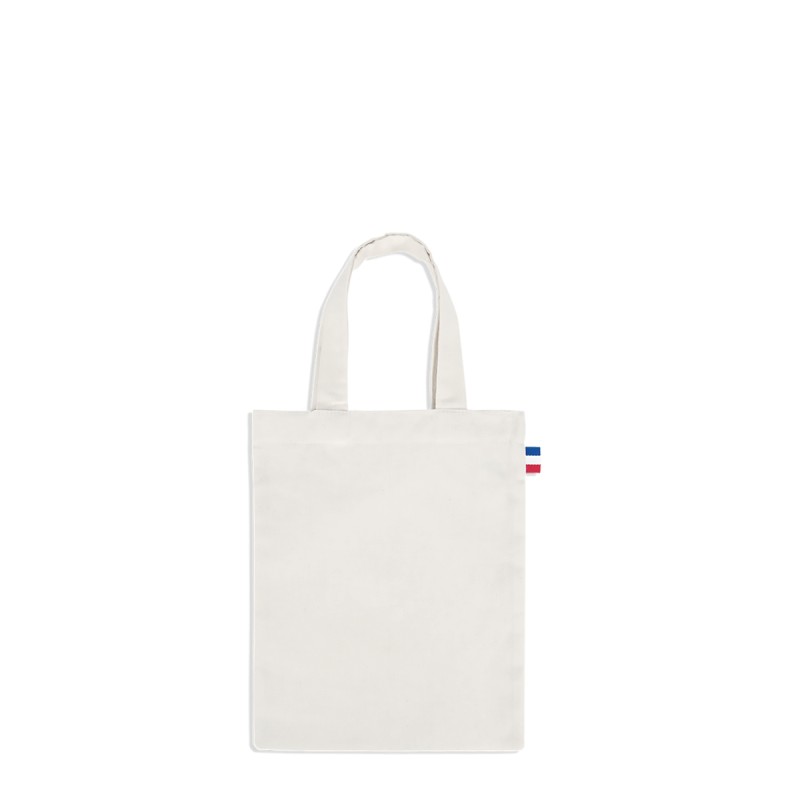 Tote bag Mini Maxime écru certifié GOTS, dimensions 20x25cm, Confection France, en 100% coton BIO - tissé France, avec anses de 2,5x30cm. Étiquette intérieure de composition avec logo Bonjour François, galon BBR sur le coté du sac. 300 pièces par carton. Toile 150g/m².