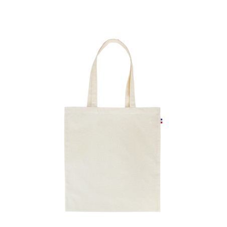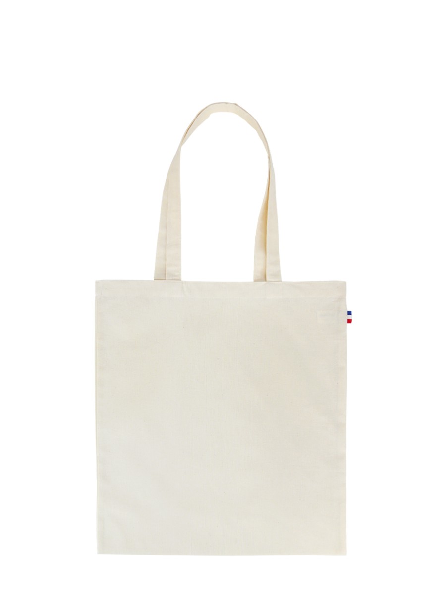 Tote bag Nino écru certifié GOTS, dimensions 38x42cm, Confection France, en 100% coton BIO - tissé France, avec anses de 2,5x60cm. Étiquette intérieure de composition avec logo Bonjour François, galon BBR sur le coté du sac. 150 pièces par carton. Demi-natté 240g/m².