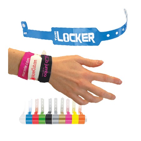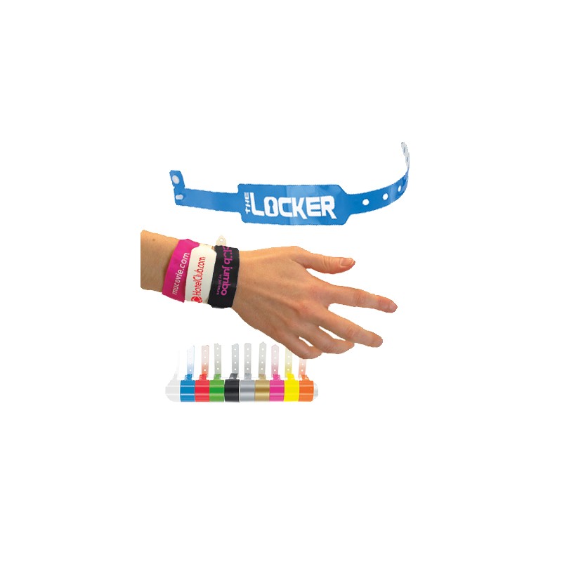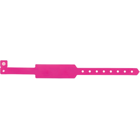 Bracelet d'Identification et évènementiels en vinyl 250x32 mm, zone élargie de 75x32mm, 10 coloris brillants et vifs pour une meilleure visibilité, longueur réglable de 15 à 24 cm pour s'adapter à tous les poignets, résistant, inviolable. Livré par plaques de 20. Marquage en 1 couleur noire ou blanc par défaut.
