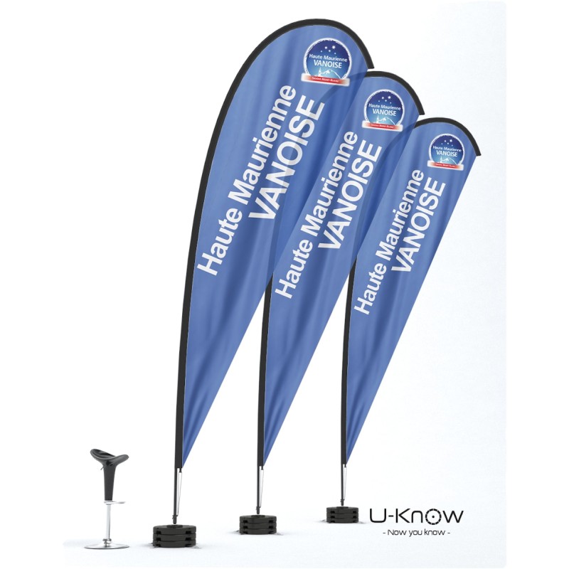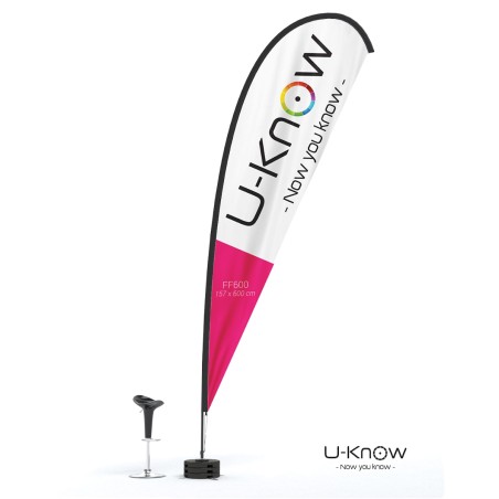 Beach flag goutte d'eau de 6m de hauteur. Voile oriflamme en matière 100% polyester 115g/m². Seule une impression recto seule est possible. L'impression est réalisée en quadri numérique et visible au verso par transparence. Le fourreau noir de la voile est renforcé et fabriqué dans un polyester Oxford 300 D. Le mât est en fibre de carbone (très résistant). Le mât se fixe sur le croisillon acier monté sur un axe de rotation spécial à roulement à billes MATP90. Il convient de lester avec au moins 3 socles PVC Béton sans axe de rotation (réf:MATP31) pour obtenir une bonne résistance aux vents pour ces oriflammes géantes. Utilisation extérieure exclusivement. Garanti pour un vent inférieur à 70 km/h..Structure disponible sur stock dans notre entrepôt parisien, impression réalisée après validation de la commande