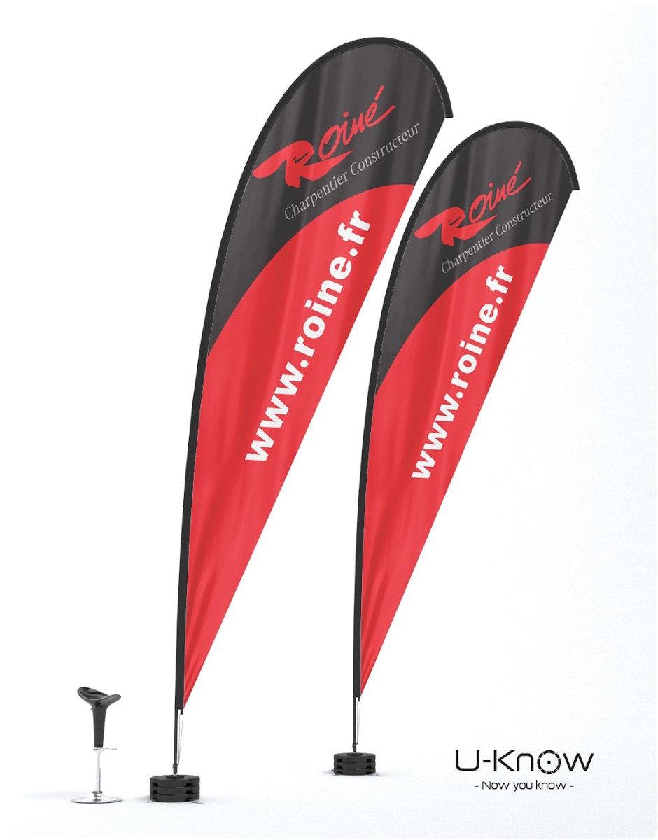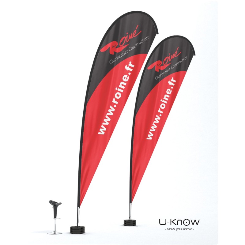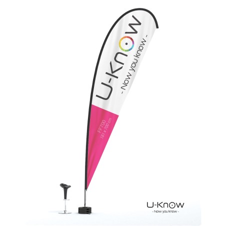 Beach flag goutte d'eau de 7m de hauteur. Voile oriflamme en matière 100% polyester 115g/m². Seule une impression recto seule est possible. L'impression est réalisée en quadri numérique et visible au verso par transparence. Le fourreau noir de la voile est renforcé et fabriqué dans un polyester Oxford 300 D. Le mât est en fibre de carbone (très résistant). Le mât se fixe sur le croisillon acier monté sur un axe de rotation spécial à roulement à billes MATP90. Il convient de lester avec au moins 3 socles PVC Béton sans axe de rotation (réf:MATP31) pour obtenir une bonne résistance aux vents pour ces oriflammes géantes. Utilisation extérieure exclusivement. Garanti pour un vent inférieur à 70 km/h..Structure disponible sur stock dans notre entrepôt parisien, impression réalisée après validation de la commande