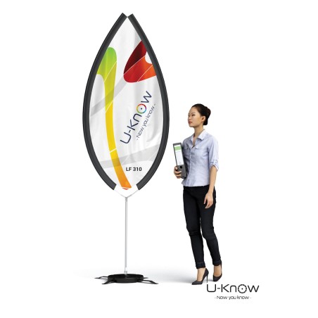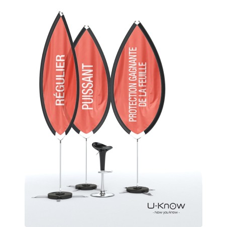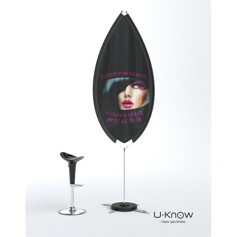 Beach flag format feuille de3,10m de hauteur. Voile oriflamme en matière 100% polyester 115g/m². En impression recto seul, le visuel est visible sur l'autre côté par transparence. En impression numérique, il est possible d'imprimer en recto/verso ; une feuille occultante insérée entre les deux côtés permet d'avoir une meilleure lisbilité. Le fourreau noir de la voile est renforcé et fabriqué dans un polyester Oxford 300 D. Le mât est en fibre de carbone (très résistant). Les mâts se fixent sur tous les pieds de la même manière. L'axe de rotation présent sur les pieds pivote à 360°. Les voiles se tendent sur tous les mâts grâce à un élastique. Utilisation intérieure et extérieure. Garanti pour un vent inférieur à 30 km/h..Structure disponible sur stock dans notre entrepôt parisien, impression réalisée après validation de la commande