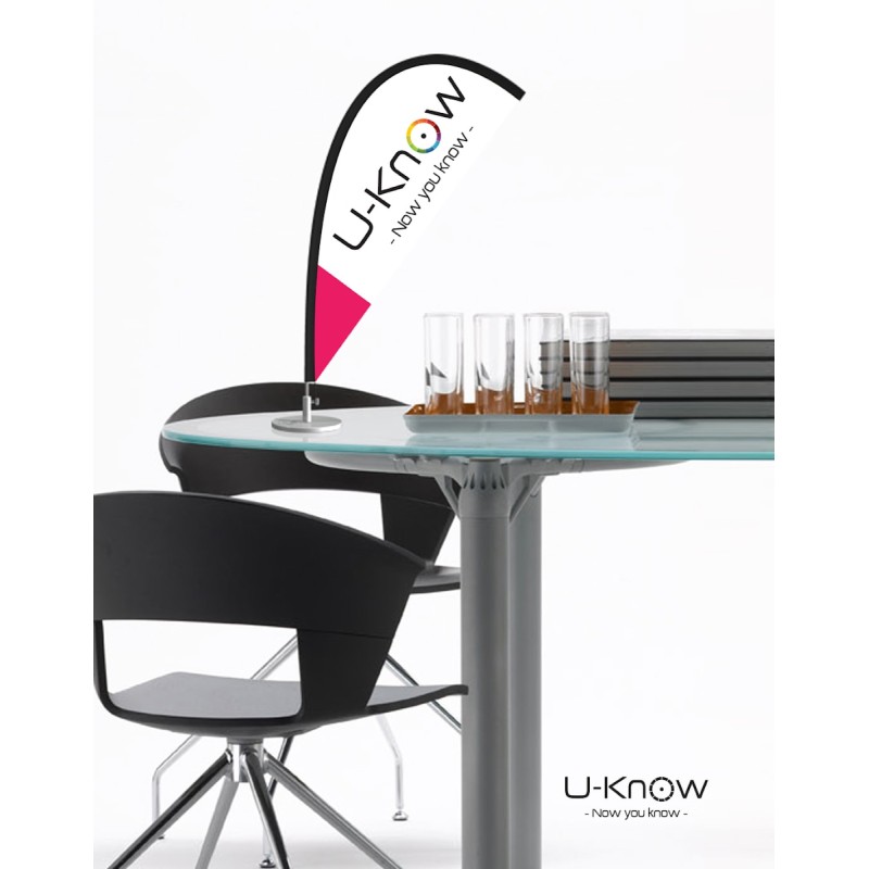 Mini oriflamme de table / flag de bureau personnalisé avec support rond en aluminium. Utilisation intérieure. Voile en matière 100% polyester 115g/m². Impression en sublimation numérique. Impression traversée visible de l'autre côté par transparence. Mât en métal. Sacoche de transport polyester taffetas offerte.Structure disponible sur stock dans notre entrepôt parisien, impression réalisée après validation de la commande