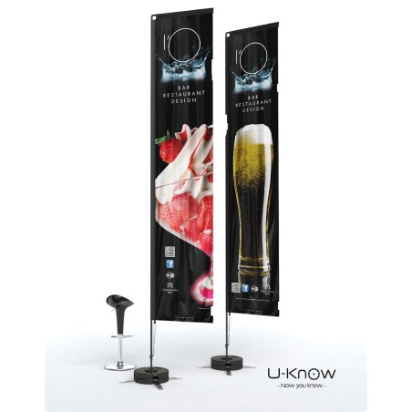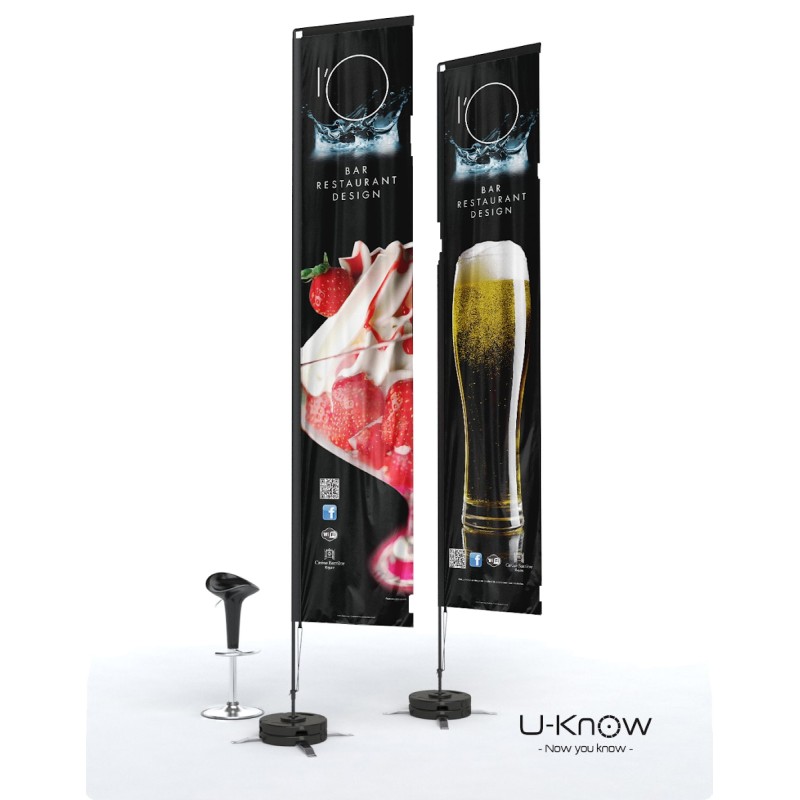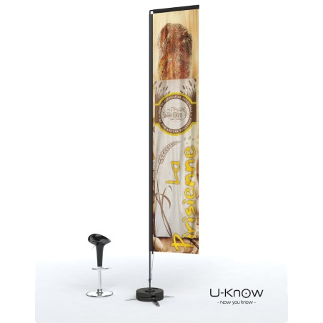 Beach flag en H ou rectangulaire de 4,8m de hauteur. Voile oriflamme en matière 100% polyester 115g/m². 2 techniques d'impressions possibles : numérique ou sérigraphique (MOQ de 50 pcs en sérigraphie). En impression recto seul, le visuel est visible sur l'autre côté par transparence. En impression numérique, il est possible d'imprimer en recto/verso ; une feuille occultante insérée entre les deux côtés permet d'avoir une meilleure lisbilité. Le fourreau noir de la voile est renforcé et fabriqué dans un polyester Oxford 300 D. Le mât est en fibre de carbone (très résistant). Les mâts se fixent sur tous les pieds de la même manière. L'axe de rotation présent sur les pieds pivote à 360°. Les voiles se tendent sur tous les mâts grâce à un élastique. Utilisation intérieure et extérieure. Garanti pour un vent inférieur à 70 km/h..Structure disponible sur stock dans notre entrepôt parisien, impression réalisée après validation de la commande