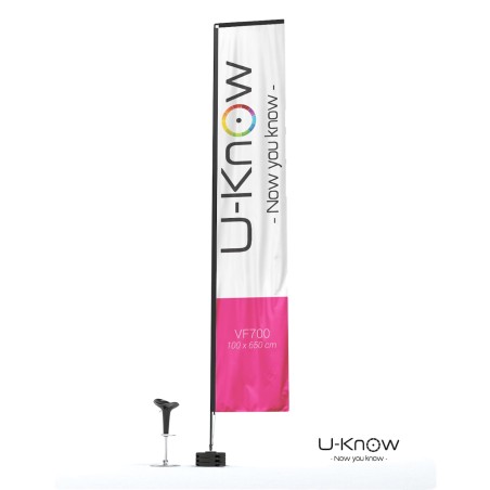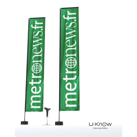 Beach flag en H ou rectangulaire de 7m de hauteur. Voile oriflamme en matière 100% polyester 115g/m². Seule une impression recto seule est possible. L'impression est réalisée en quadri numérique et visible au verso par transparence. Le fourreau noir de la voile est renforcé et fabriqué dans un polyester Oxford 300 D. Le mât est en fibre de carbone (très résistant). Le mât se fixe sur le croisillon acier monté sur un axe de rotation spécial à roulement à billes MATP90. Il convient de lester avec au moins 3 socles PVC Béton sans axe de rotation (réf:MATP31) pour obtenir une bonne résistance aux vents pour ces oriflammes géantes. Utilisation extérieure exclusivement. Garanti pour un vent inférieur à 70 km/h..Structure disponible sur stock dans notre entrepôt parisien, impression réalisée après validation de la commande