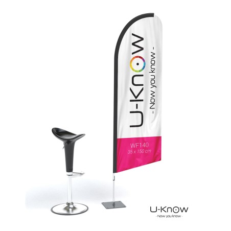 Beach flag plume / aile d'avion classique de 1,4m de hauteur. Voile oriflamme en matière 100% polyester 115g/m². 2 techniques d'impressions possibles : numérique ou sérigraphique (MOQ de 50 pcs en sérigraphie). En impression recto seul, le visuel est visible sur l'autre côté par transparence. En impression numérique, il est possible d'imprimer en recto/verso ; une feuille occultante insérée entre les deux côtés permet d'avoir une meilleure lisbilité. Le fourreau noir de la voile est renforcé et fabriqué dans un polyester Oxford 300 D. Le mât est en fibre de verre (très résistant). Les mâts se fixent sur tous les pieds de la même manière. L'axe de rotation présent sur les pieds pivote à 360°. Les voiles se tendent sur tous les mâts grâce à un élastique. Utilisation intérieure exclusivement..Structure disponible sur stock dans notre entrepôt parisien, impression réalisée après validation de la commande